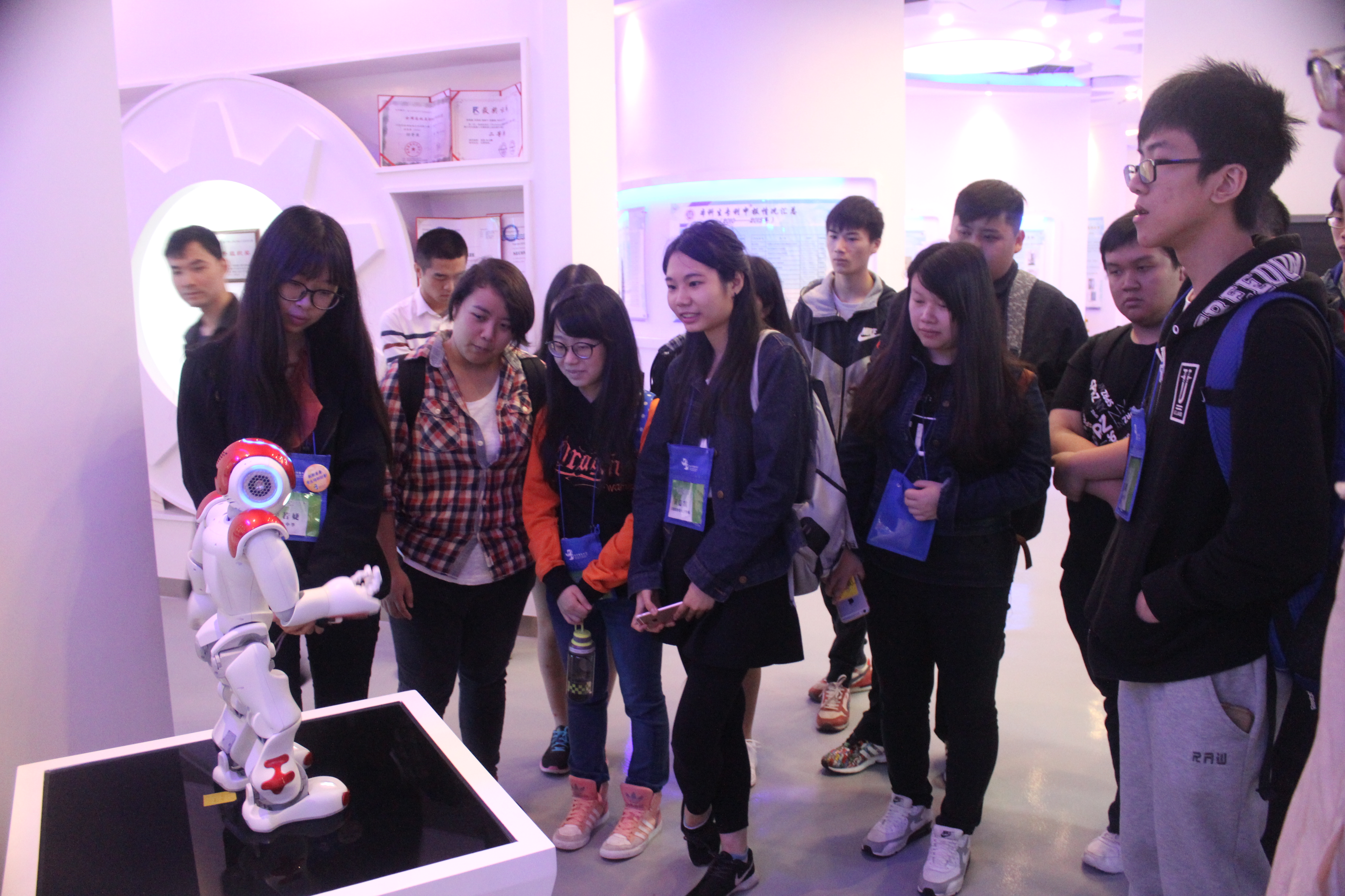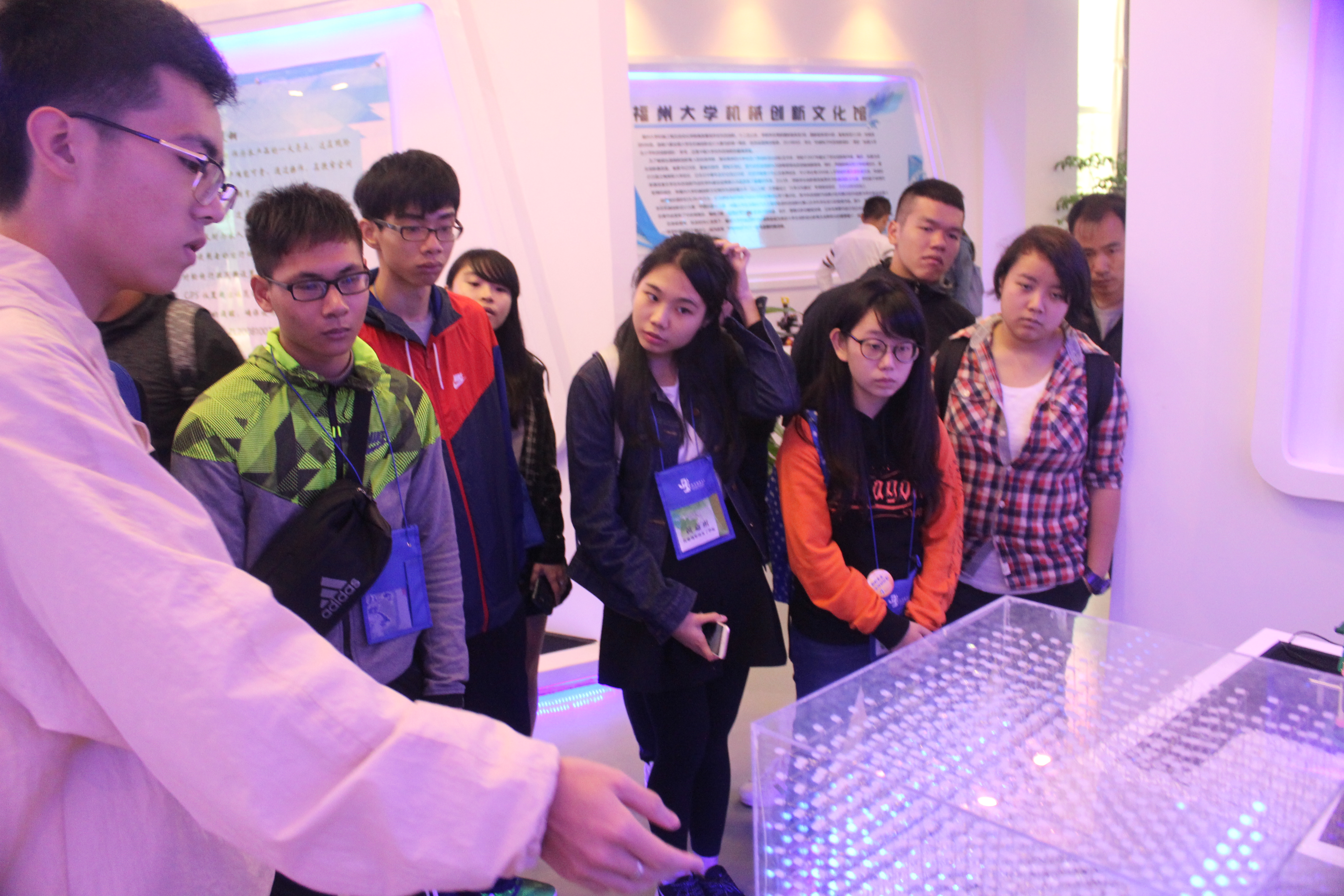4月27日,澳门中科创客学员到达我校,在av大平台 14级辅导员滕培秀老师的陪同下参观了av大平台 的科技创新文化馆。