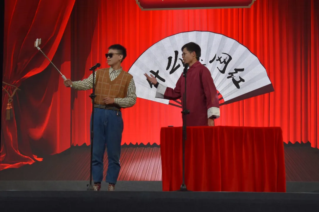而后是晚会必备的语言类节目——相声《什么是网红》,机械学院的马嘉浩同学和物信学院的同学一捧一逗,用幽默诙谐的语言、生动的神态和入戏的动作讽刺了如今哗众取宠的网红热潮,使得台下同学不时随着包袱捧腹大笑、拍手叫好。