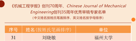 钟舜聪教授当选学报第十二届编委会委员,刘晓敏教授获评学报“近十年优秀审稿专家”,标志着学院在机械工程领域的综合影响力得到进一步提升。