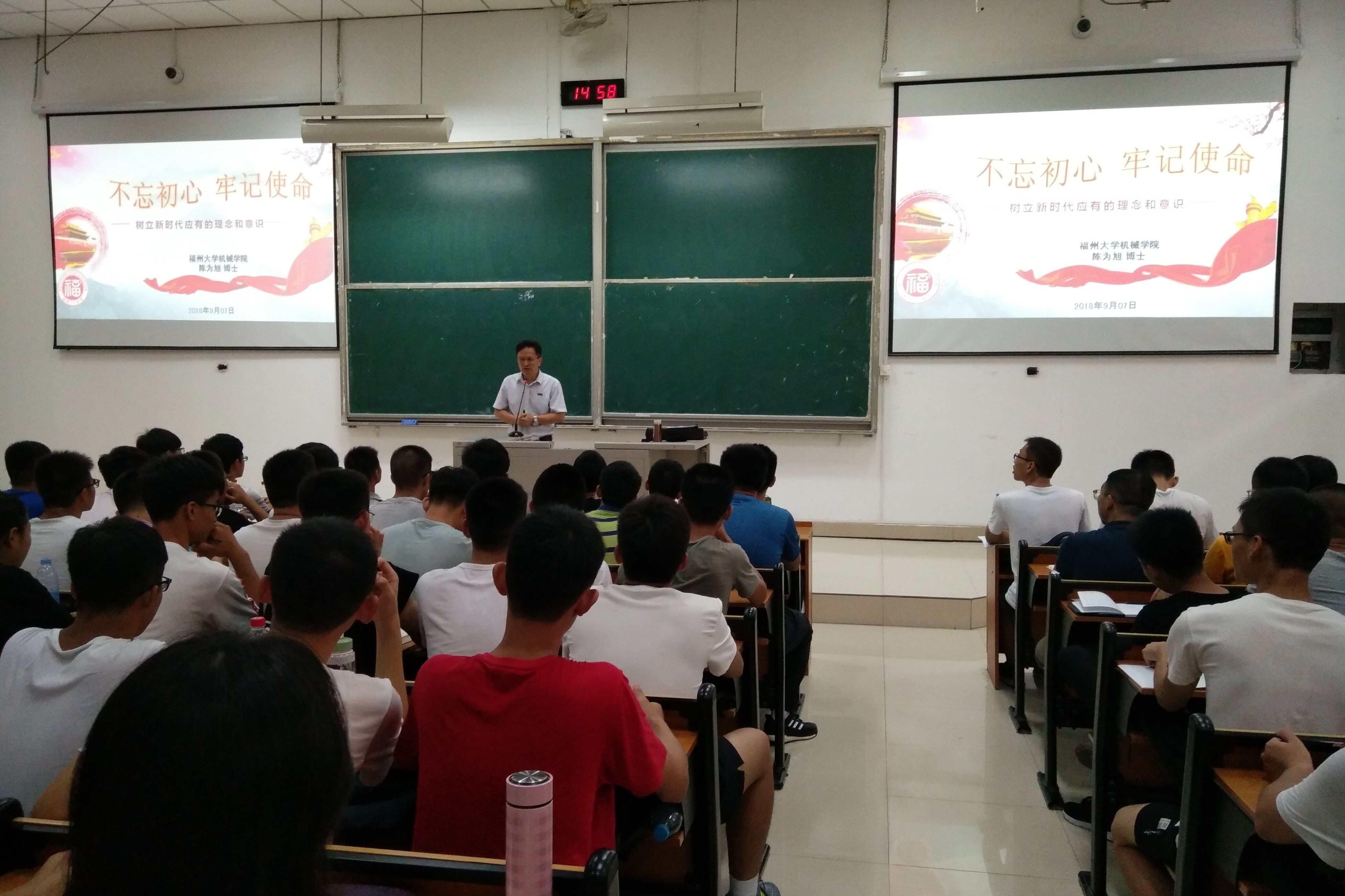于文三-101举办主题为“不忘初心,牢记使命”的新生教育讲座。会议由党委书记陈为旭研究员主讲,av大平台