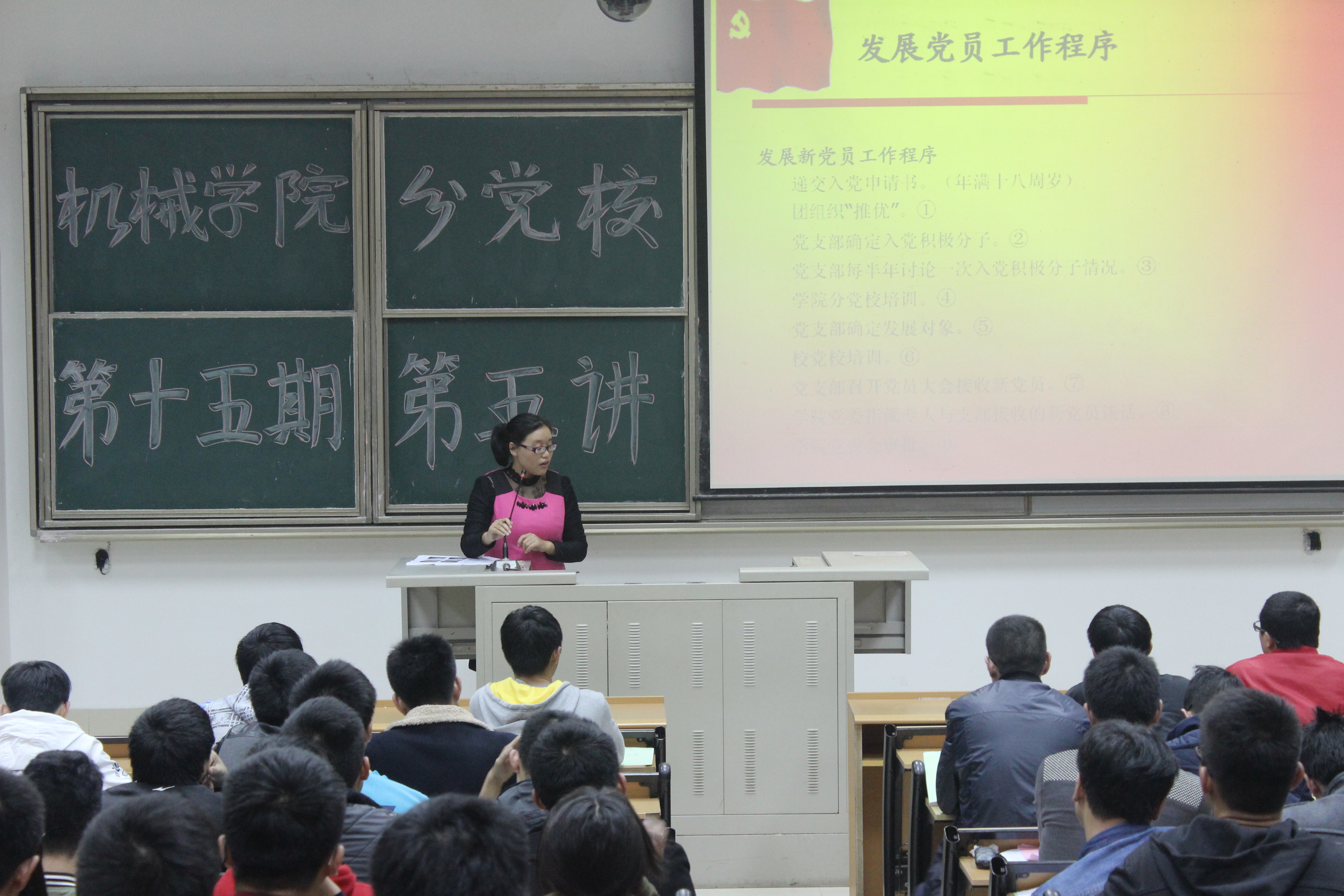 入党积极分子入党的需求,滕培秀老师特地以“从入党材料的撰写看党风党性及党员的修养”为主题进行授课。滕培秀老师从发展党员工作程序中为入党积极分子讲述了入党材料撰写的重要性。接着,老师又从多种入党材料进行分析,其中包括入党申请书的撰写、思想汇报的撰写、思想汇报检查表的填写、入党志愿书的撰写等,结合各种规范例文,为大家上了一堂极为重要的课。