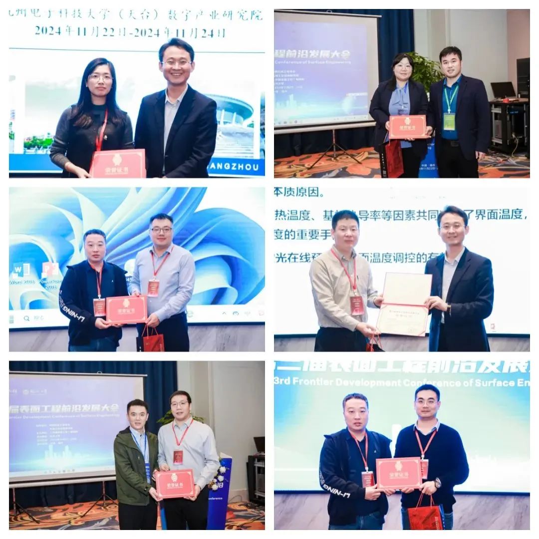 副校长郭文忠教授为获奖者代表颁发获奖证书。中国机械工程学会副秘书长王淑芹宣读了《中国表面工程》2023年度优秀论文名单,主编邵天敏教授、副主编谭俊研究员为获奖代表颁发了获奖证书。