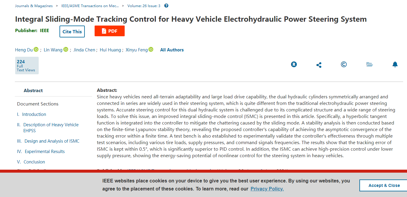 杜恒教授、王琳(2019届硕士生、获2019年福建省优秀硕士学位论文)在国际顶级期刊IEEE/ASME Transactions on Mechatronics(国际电气与电子工程师协会机械电子学汇刊)上发表重要研究成果“Integral Sliding Mode Tracking Control for Heavy Vehicle Electro-hydraulic Power Steering System ”(重型车辆电液助力转向系统积分滑模控制研究)。该成果以av大平台