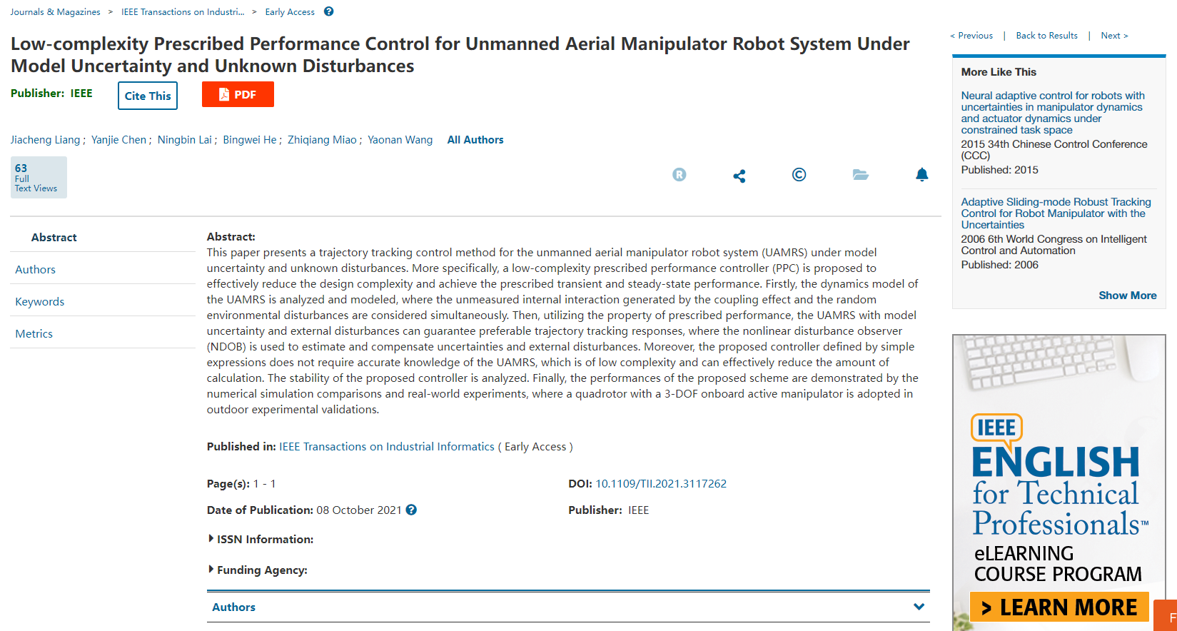 为第一署名单位发表研究成果“模型不确定和未知扰动下的无人飞行作业机器人低复杂度规定性能控制方法”。该论文由机械学院梁嘉诚(2019级硕士生)、陈彦杰博士(通讯作者)、赖宁斌(2019级硕士生)、何炳蔚教授,与湖南大学机器人视觉感知与控制技术国家工程实验室王耀南院士,缪志强副教授合作完成。