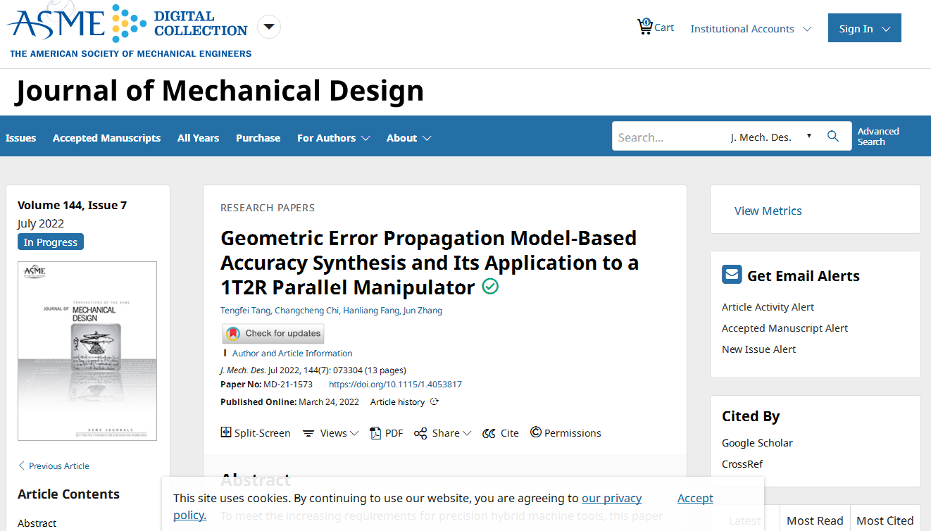 张俊教授、汤腾飞(2018级博士生)、方汉良(2019级博士生)和池长城(2021届硕士生)在机械工程国际权威期刊《美国机械工程学会汇刊》(Journal of Mechanical Design)上发表了研究成果《基于几何误差传递模型的精度综合方法及其在少自由度并联机器人上的应用》(“Geometric Error Propagation Model-Based Accuracy Synthesis and Its Application to a 1T2R Parallel Manipulator”)。该成果以av大平台