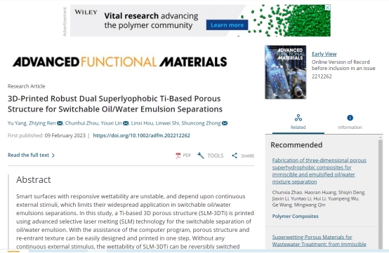 近日,我院任志英教授课题组在材料领域国际顶级期刊《先进功能材料》(Advanced Functional Materials,中科院SCI一区TOP期刊,影响因子19.924)上在线发表研究成果“3D打印自适应双超疏水的钛基多孔结构以用于可切换油/水乳液分离”(3D-Printed Robust Dual Superlyophobic Ti-Based Porous Structure for Switchable Oil/Water Emulsion Separations)。该成果以av大平台