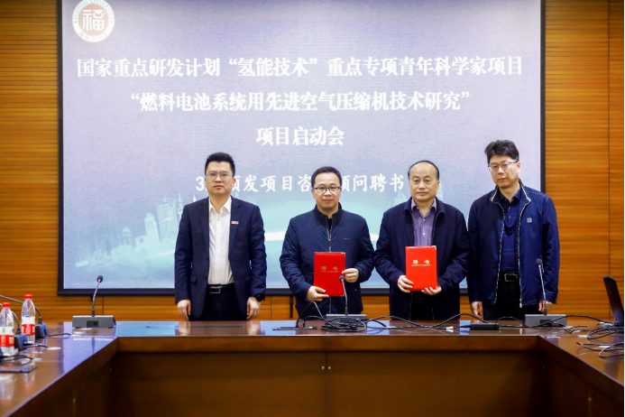 将在实验条件、人员配置、财务支出、设备购置等方面提供支持和保障,确保项目顺利实施,达到预期目标。王志锋处长指出,福建省内的氢能产业链技术环节尚不完善,空气压缩机是燃料电池系统的核心部件,其研发对促进氢能技术及产业发展十分重要,希望项目团队时刻牢记“四个面向”,以国家重大战略需求为导向,高质高效完成项目。郭文忠副校长、王志锋处长还为专家代表张久俊院士、温珍海研究员颁发了项目顾问聘书。