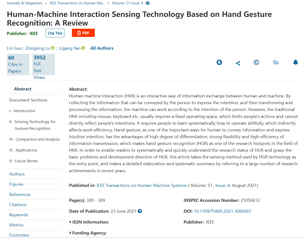 Human-Machine Interaction Sensing Technology Based on Hand Gesture Recognition: A Review论文旨在使读者能够系统、快速地了解手势识别的研究现状,揭示手势识别的基本问题和发展方向。文章以手势识别技术所采用的传感方法为切入点,通过总结近年来人机交互领域的研究成果,详细的阐述人机交互系统的研究现状,并展望未来人机交互领域的发展方向。目前,该论文在Web of Science上实时引用为54次。