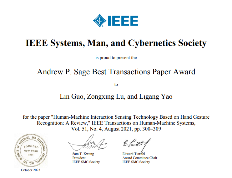 郭霖、卢宗兴、姚立纲教授共同撰写的论文“Human-Machine Interaction Sensing Technology Based on Hand Gesture Recognition: A Review”(IEEE Transactions on Human-machine Systems, 2021, 51(4): 300-309)荣获2023年IEEE SMC学会最佳论文奖(Andrew P. Sage Best Transactions Paper Award)。自1998年以来,Andrew P. Sage最佳论文奖每年从IEEE SMC学会出版的每个汇刊过去两年发表的近两千篇高质量论文中依据原创性、技术水平、对IEEE SMC感兴趣领域的潜在影响以及论文本身的写作质量等原则各遴选一篇论文授予该奖励。这是以av大平台