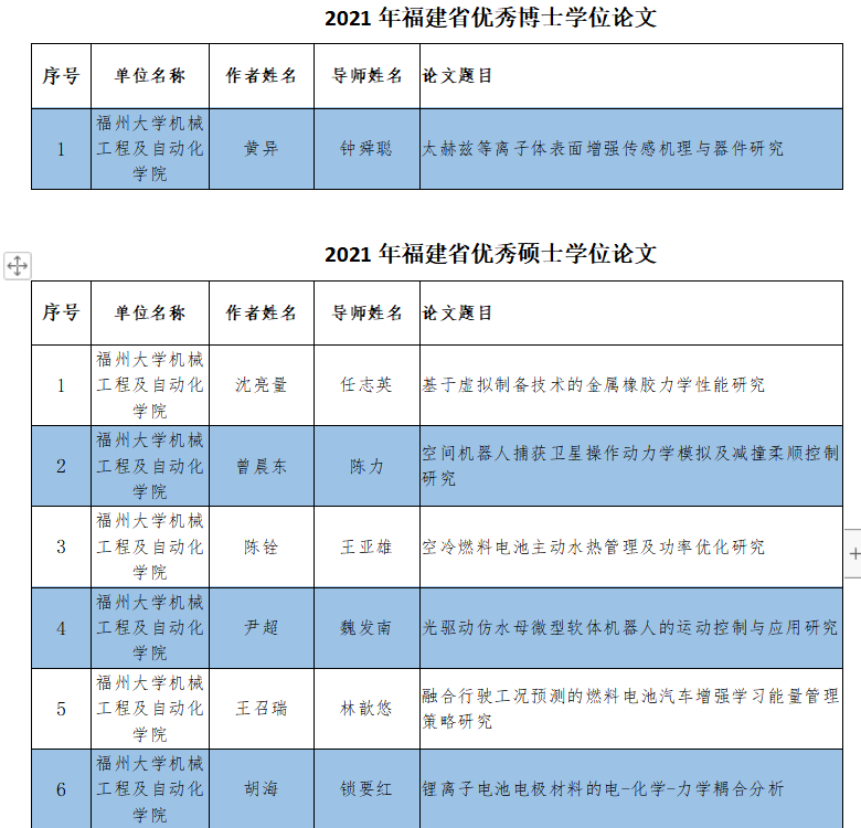 近日,福建省教育厅、福建省学位委员会发布《关于公布2021年福建省研究生优秀学位论文评选结果的通知》,根据省学位办《关于开展2021年福建省研究生优秀学位论文评选工作的通知》(闽学位办〔2022〕2号),经培养单位推荐、专家评审,钟舜聪教授指导的2017级博士研究生黄异题为《太赫兹等离子体表面增强传感机理与器件研究》的学位论文荣获2021年“福建省优秀博士学位论文”;任志英教授指导的2018级硕士研究生沈亮量题为《基于虚拟制备技术的金属橡胶力学性能研究》的学位论文、陈力教授指导的2018级硕士研究生曾晨东题为《空间机器人捕获卫星操作动力学模拟及减撞柔顺控制研究》的学位论文、王亚雄教授指导的2018级硕士研究生陈铨题为《空冷燃料电池主动水热管理及功率优化研究》的学位论文、魏发南副教授指导的2018级硕士研究生尹超题为《光驱动仿水母微型软体机器人的运动控制与应用研究》的学位论文、林歆悠副教授指导的2018级硕士研究生王召瑞题为《融合行驶工况预测的燃料电池汽车增强学习能量管理策略研究》的学位论文、锁要红教授指导的2018级硕士研究生胡海题为《锂离子电池电极材料的电-化学-力学耦合分析》的学位论文荣获2021年“福建省优秀硕士学位论文”。以上7位博硕士学位论文的入选是av大平台