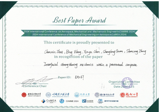 博士研究生赵陈敏题为Interfacial strengthening mechanics within a prestrained composite的论文,获大会最佳论文奖。论文主要介绍了他在纤维预应力复合材料界面增强机理方面的最新研究进展,相关研究发表SCI论文5篇,入选ESI高被引论文1篇,已授权发明专利1件。