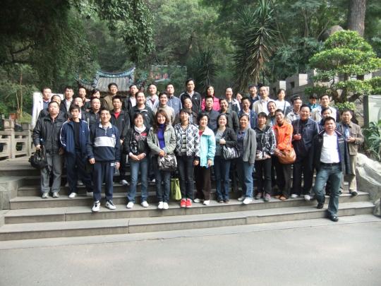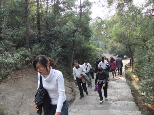 横穿整个福州市区,不一会工夫汽车就到达下院鼓山山门前。工会主席进行简单鼓劲动员和合影后,大家就不甘落后、迫不及待地大步向山顶进发了。上山登山道有三条:登山古道、“松之恋”登山道、“勇敢者”登山道。比较再三,大家还是不约而同地选择了登山古道。鼓山登山古道从下院至万松湾,全长3.5公里,是福州市迄今为止保存最好、利用率最高的古道,至今已有近1000年的历史。虽是古道,但古道石阶被修整得整洁、干净,石阶已全呈黛青色,那是几百年来上山信徒、游览者及登山健身者们汗水“浸染”成的。重新修缮的石灯柱每隔10米左右沿着登山道的石阶整齐地向上延伸排列,而且每个灯柱上都有编号。