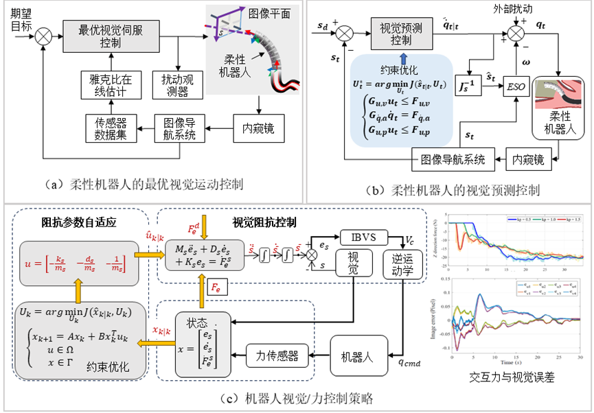 在柔性机器人控制方面,在运动控制、形状控制及安全交互控制等方向有良好的技术及方法积累。 针对腔道内自主导航难题,提出了柔性机器人最优视觉伺服控制方法,提出了可视化约束下的视觉运动控制方法,结合模型预测控制实现了柔性机器人最优控制;面向柔性机器人复杂形变控制需求,提出了数据驱动的形状控制方法,实现柔性机器人最优形状控制调控;针对机器人与环境间安全交互难题,提出了机器人视觉阻抗控制方法,保障了运动定位的高精度和接触交互的柔顺性。
