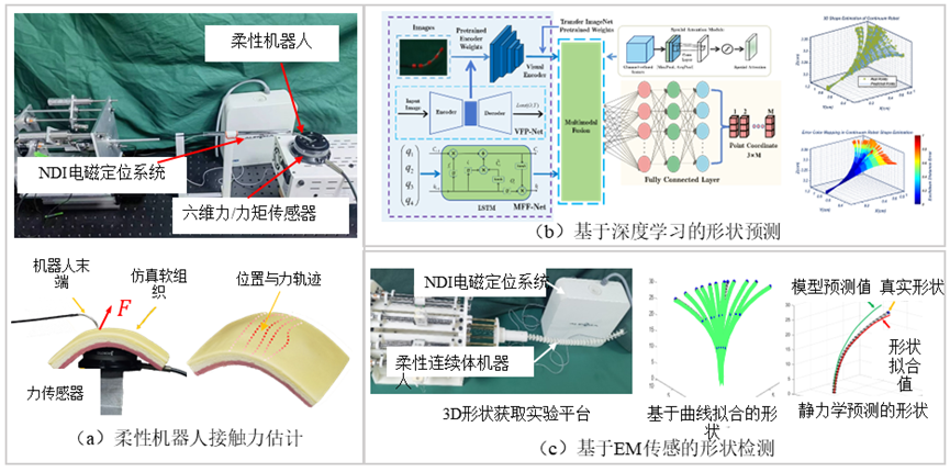 在柔性机器人的感知方法方面积累了良好的理论基础和实践经验。提出了基于深度学习的形状感知方法,开展了基于Cosserat-Rod模型的形状预测方法,实现柔性机器人三维形状感知;提出了将接触力感知建立为优化问题,提出了机器人接触力估计方法,应用于手术机器人安全运动控制中,建立基于损伤生物力学的接触力阈值建模和接触模态识别方法,保证机器人手术操作的安全性。