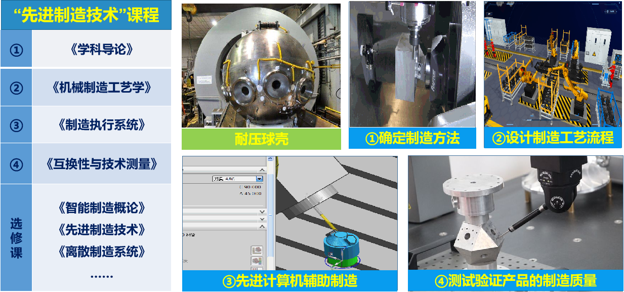 为了完成深海极端压力下耐压球壳的先进制造,需要:确定合适的制造方法、设计合理的制造工艺流程、实施先进的计算机辅助制造、测试验证产品的制造质量。该专业分别设置有《学科导论》、《互换性与技术测量》、《机械制造工艺学》、《制造执行系统》等课程,通过系统的学习,全面提升先进制造技术的开发能力。