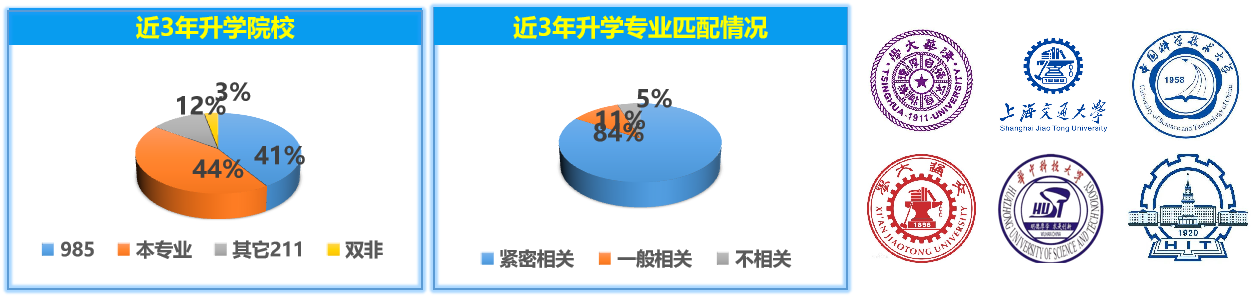 在升学攻读研究生方面,该专业具有推荐优秀应届本科毕业生免试攻读硕士学位研究生资格,年均推荐人数约占学生总数的10%;近3年,本科毕业生的升学高校中,985和211高校占比约97%,其中包含清华大学、上海交通大学、中国科学技术大学等知名高校。