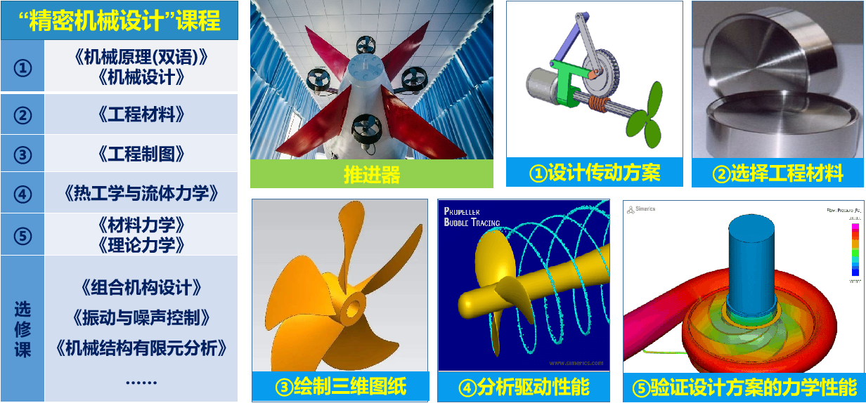 为了完成特种螺旋桨推进器的精密设计,需要:提出高性能的传动方案、选择合适的工程材料、绘制装置的三维图纸、分析深海低温高压下的驱动性能、验证所设计方案的力学性能能否满足要求。针对这些设计工作需求,该专业设置有《机械原理》、《机械设计》、《工程材料》、《工程制图》、《热工学与流体力学》、《材料力学》和《理论力学》等课程,同时还开设有丰富的选修课程,通过系统的学习,全面提升精密机械设计的开发能力。