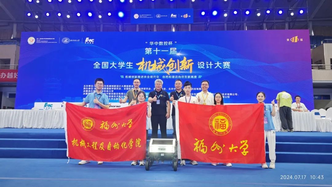 学子石阮晨、陈德兰、范硕、王忆婷、熊依菲研制的《面向山地环境的智能化电驱动豌豆播种机》(指导老师:张俊、杨富富)获得一等奖(最高奖);王锐沣、陈 凯、何晨曦、陈炜灿、曹东旭研制的《福大无畏号仿生青蛙》(指导老师:蔡英杰、朱明珠)获得二等奖;彭良辉、胡索图、谭玉豪、谢建豪、谢思妍研制的《莴笋收割机》(指导老师:章小龙、黄惠)获得三等奖。
