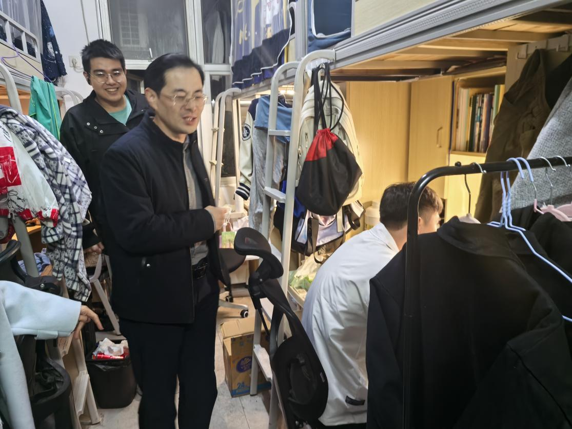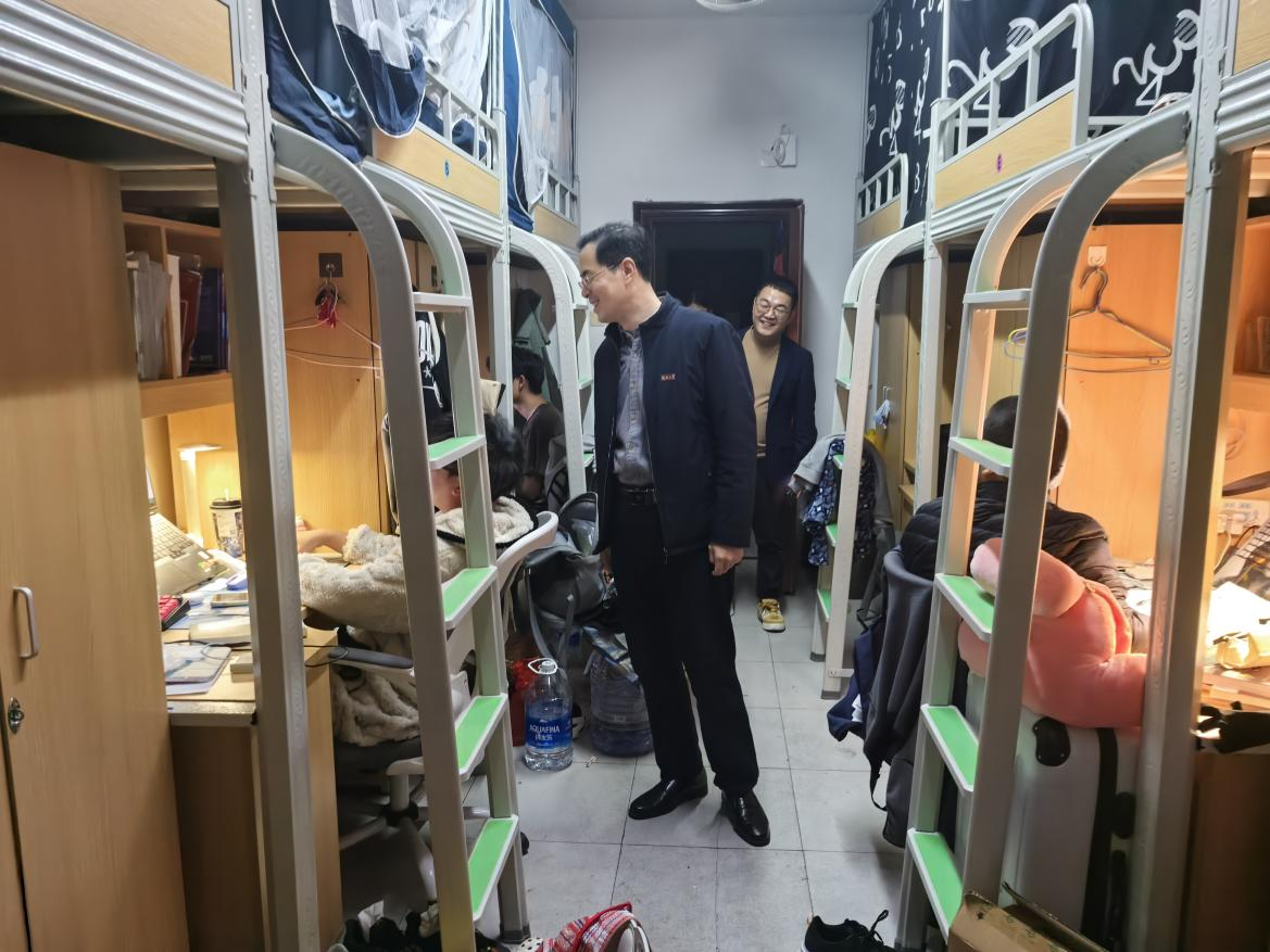 学院党委副书记孙鋆深入学生宿舍,为考研学子送去温情关怀。勉励同学们要坚守考研,饮食作息规律,劳逸结合,放平心态,一站成硕。