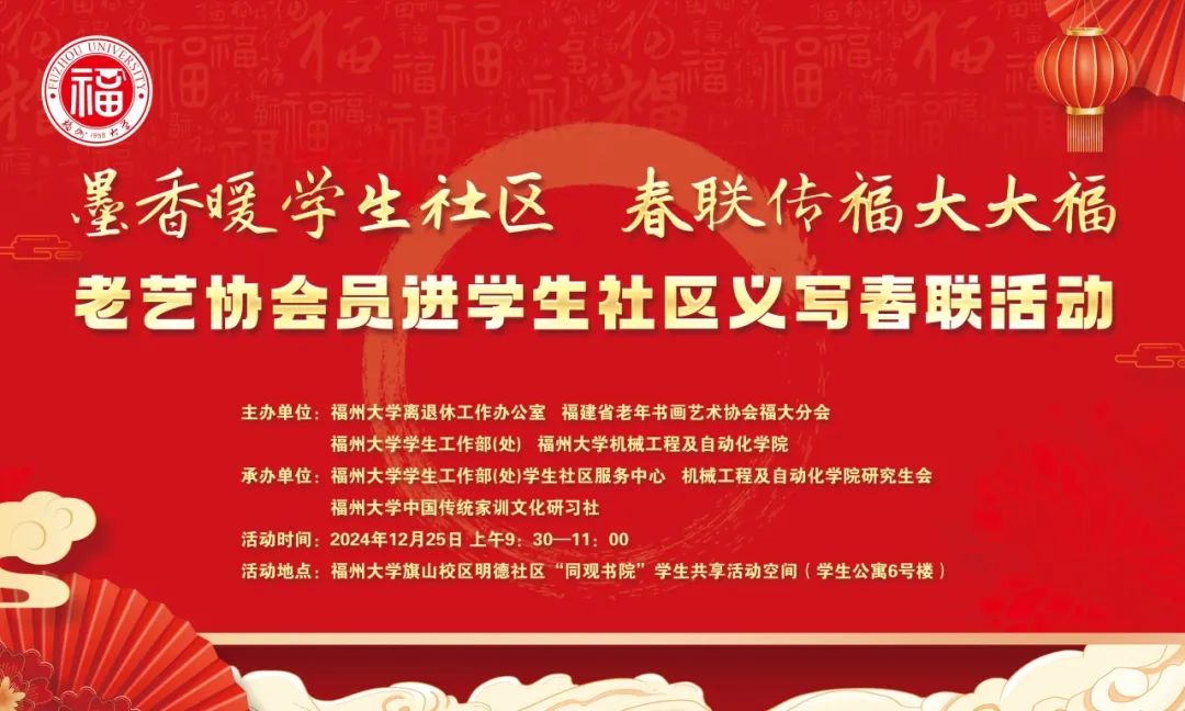 为深入学习贯彻党的二十大和二十届三中全会精神,传承和弘扬中华优秀传统文化,积极践行社会主义核心价值观,特组织开展“墨香暖学生社区,春联传福大大福”——老艺协会员进学生社区义写春联活动,发挥好家风、好家教在文化育人中的重要作用,打造具有温度和深度的传统文化育人品牌,丰富和提升校园文化氛围。