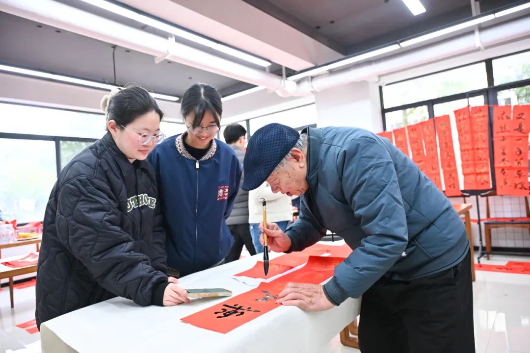 同学们围在书法家身旁,领略流畅洒脱的笔法之美,聆听春联背后丰富的文化故事。大家在老艺术家们的指导下纷纷动手书写春联,亲身体验中华传统书法的独特魅力。现场气氛热烈又温馨,欢声笑语不绝于耳。