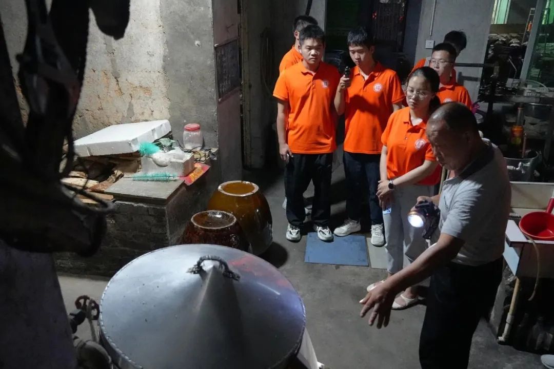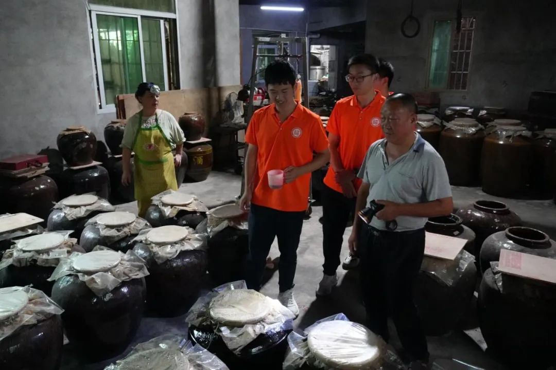 为了让队员们有更直观的体验和认知,张总带领实践队员们现场参观客家米酒酿造全过程。其以糯米为主要原料,经过洗米浸泡、蒸煮、拌曲、发酵(陶缸发酵)、抽取、沉淀(去除杂质)、蒸馏等多道工序,之后装缸贮存让酒液自然陈化,最后完成灌装。参观过程中,张总邀请实践队员品尝半甘型米酒,实践队员谢思涵品尝后赞美道:“入口的瞬间,酒的甜与醇形成了鲜明对比。”