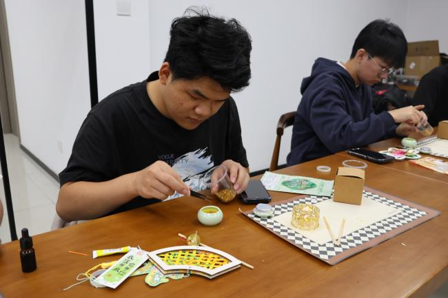 材料台上,桂花干、天然蜂蜡、植物精油依次排开,像一列等待检阅的“秋日方阵”。陈恩婷老师先带大家“识香”——辨桂花品种、讲精油萃取;再示范“调香”——加热、倒模,一整套动作行云流水。最后,他公开独家“最佳配比”,让同学们手握“黄金配方”,放心大胆地把秋天锁进小小盒中。