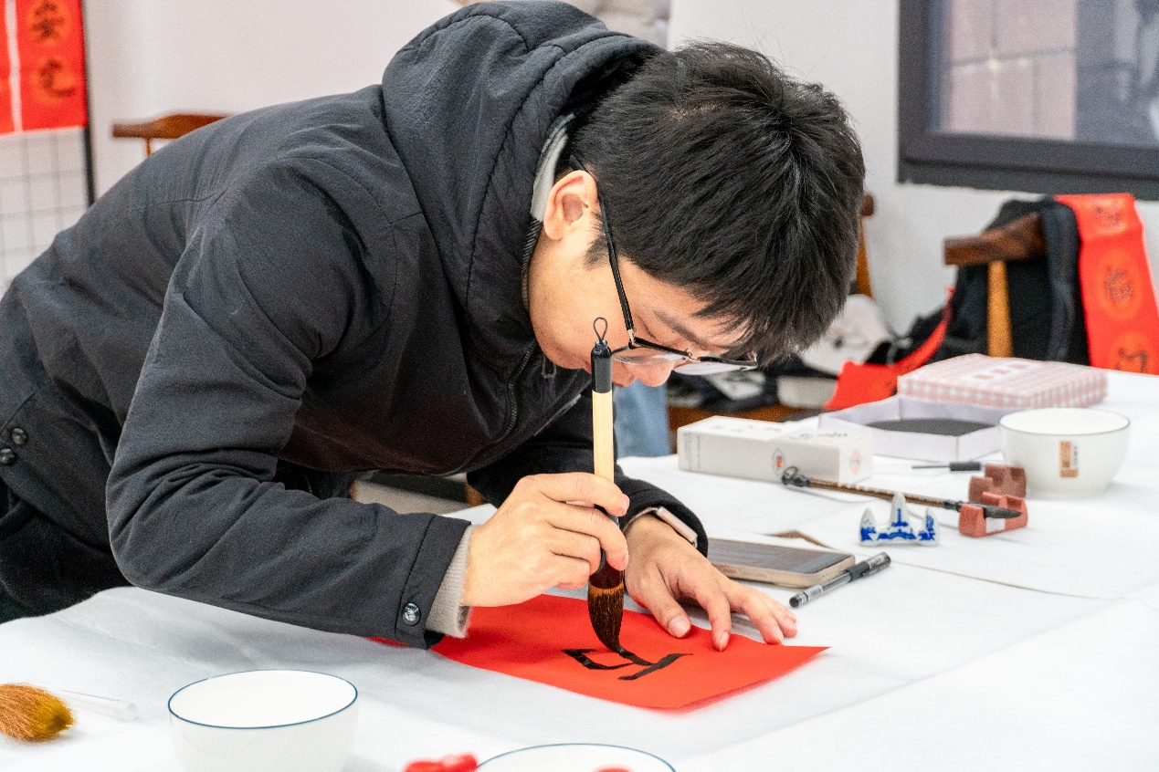 活动中,同学们积极参与其中,他们提杆起笔,书写下飘逸的字迹,在字里寄托自己的美好祈愿和深情祝福。同学们围绕着老艺术家的身旁,领略老艺术家们的笔法之美,倾听在春联背后的传说故事,纷纷动手参与进来亲身体验书法的魅力。