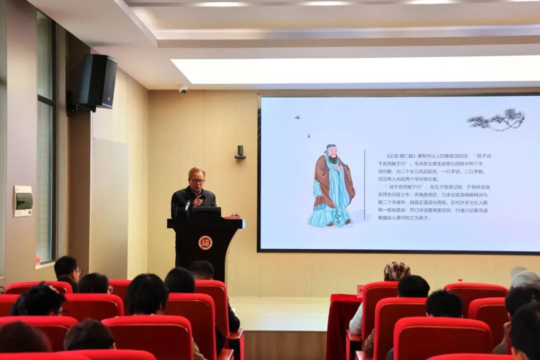 蔡尔申院长以生动的语言,畅谈自己对于传统文化的理解,以《论语》中“君子讷于言而敏于行”作引,深刻阐释了“讷”“敏”二字丰富的内涵。讷,是言语上的克制、慎重,是向内收敛、沉心思考;敏,是行动上的迅捷、勤勉,是向外实践、果断有为。他认为,在开口说话时,应当深思熟虑,清楚而无误地表达自己的语言,而在付诸行动时,要迅速有效并适时调整。