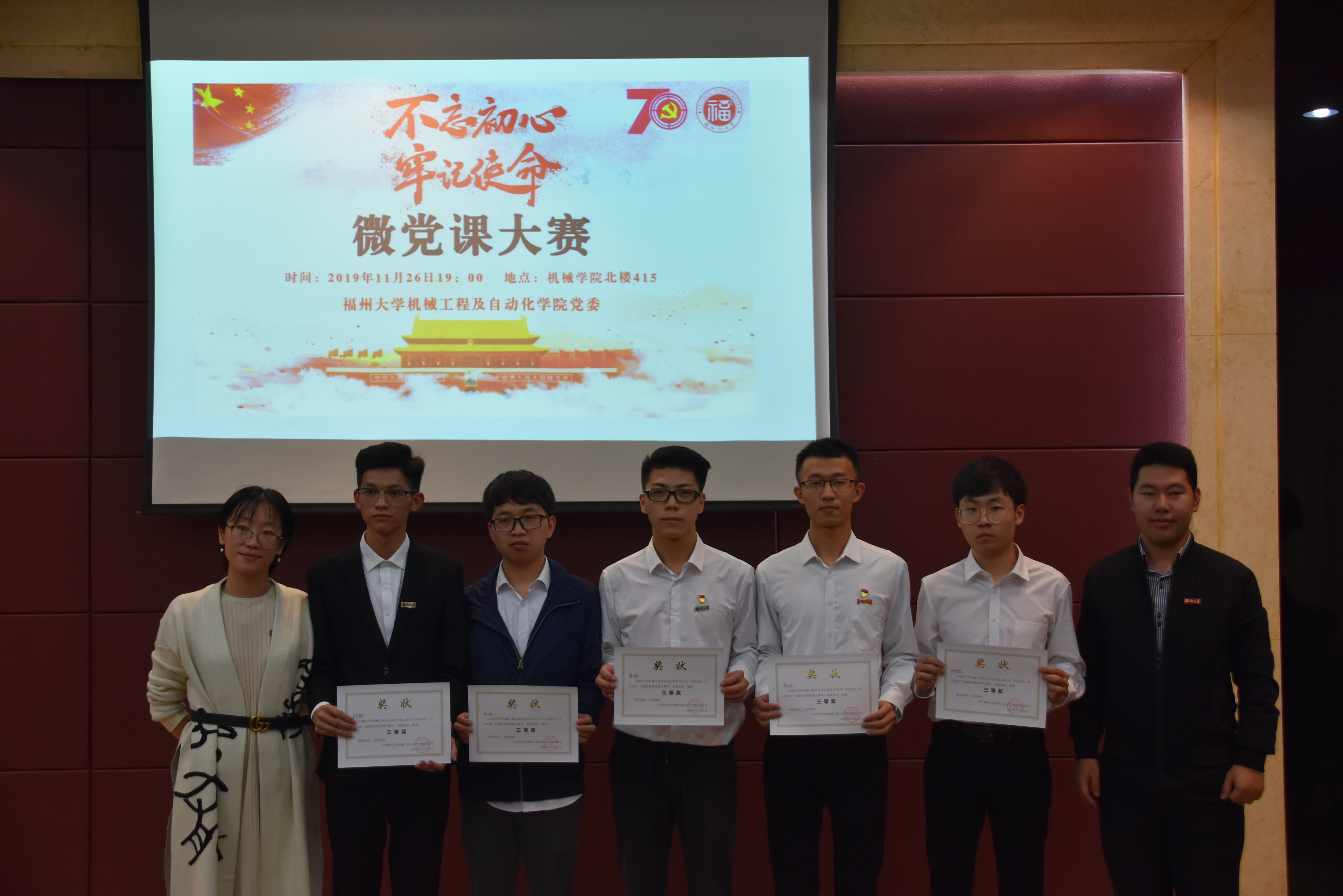 11月26日,机械工程自动化学院第一届“不忘初心、牢记使命”微党课大赛在机南401成功举办。电气学院党办主任衷欢老师、电气学院组织员胡培杰老师、机械学院党办主任陈劼老师、机械学院组织员刘旭莹老师、机械学院17级辅导员陈伯豪老师以及机械学院分党校第十九期入党积极分子培训班成员参加本次大赛。