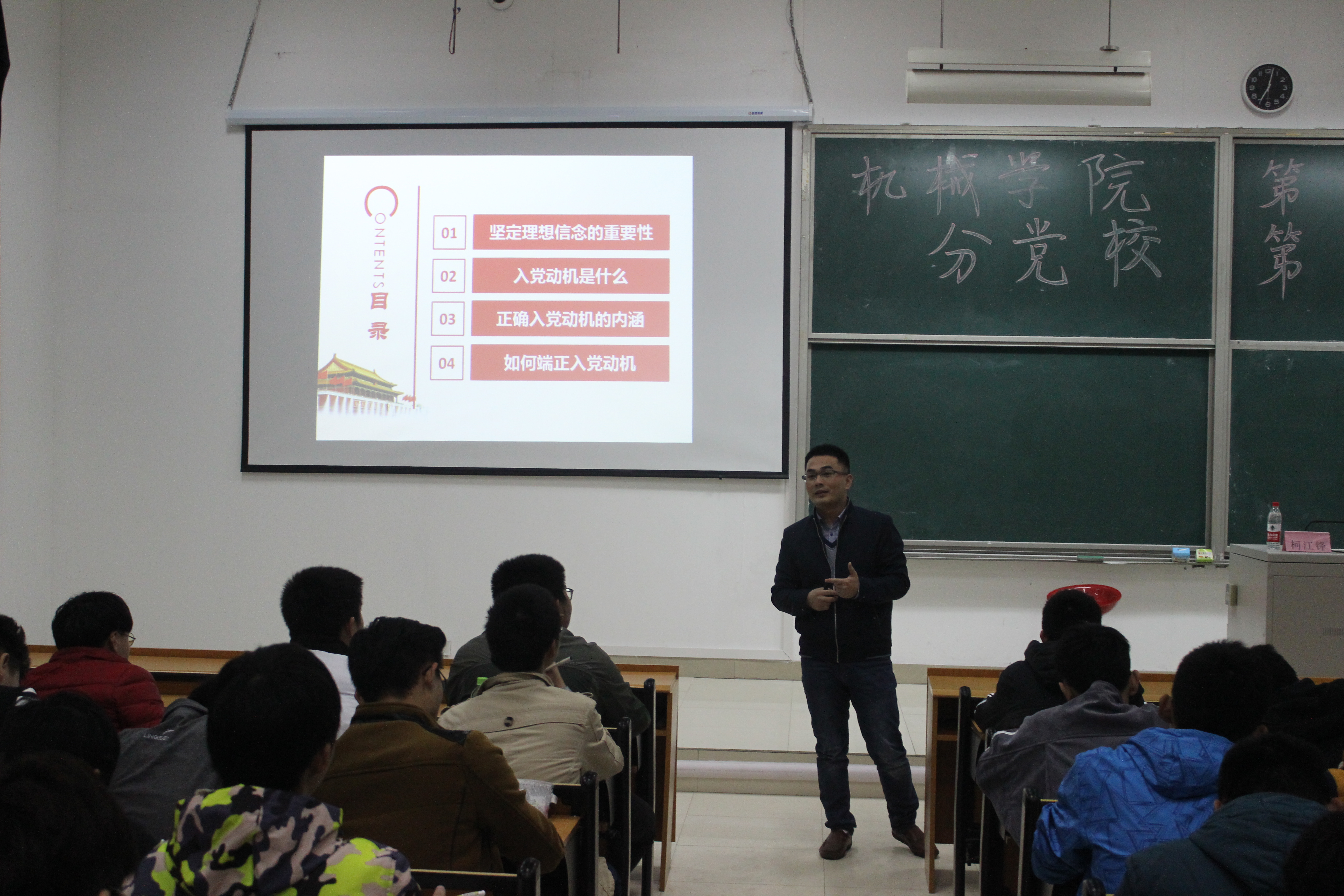 首先,柯江锋老师指出了坚定理想信念的重要性,随即从“入党动机是什么”、“正确入党动机的内涵”以及“如何端正入党动机”三个方面展开了此次党课。期间,柯江锋老师为大家诠释了共产党坚定不可动摇的地位,并强调党积分子坚定理想信念的重要性。课上柯江锋老师提出了许多问题,现场的同学们也积极回答,使整节党课变得更精彩更有感染力。