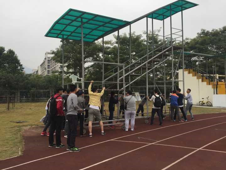 为了校运会期间操场能够干净整洁,志愿者们帮助工作人员清理田径场的所有垃圾桶,并将它们放置到指定位置。为了裁判老师们能够有一个整洁的工作环境,志愿者们帮助裁判们将主席台打扫干净,将物品摆放整齐,将器材室整理好。为了裁判们能够有一个最佳视角观看比赛,志愿者们将大型裁判席推至径赛终点处。