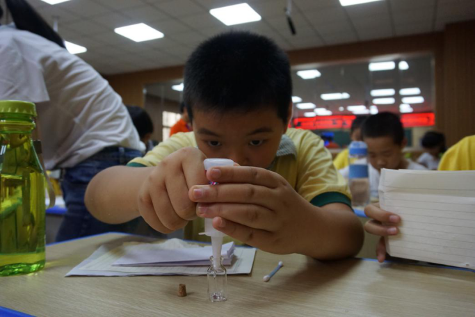 解说志愿者先把全部的操作过程先简单演示一遍,再分发材料,让每个组的志愿者来按照各组人员配比来配备瓶子,胶水,夜光砂,棉签。孩子们一开始相当兴奋,嗷嗷地拿起自己带的水杯子向包有夜光砂的纸上使劲地砸,整个教室都是“砰砰砰”的声音,堪称是整个夏令营最“暴力”的制作活动。最后关上灯的时候,黑乎乎的,唯有各自做好的星空瓶发出蓝色的、绿色的荧光,全场一片尖叫。之后,让同学们用小纸条写下自己的愿望,塞进瓶子里,成了愿望瓶,希望他们的愿望如同夜空中最亮的星般可以闪闪发光。