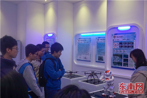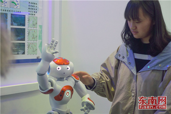 在此次参与展览的作品中,最吸人眼球莫过于来自机械学院创新实验室的NAO机器人,该作品是机器人创客编程大赛中最佳创意奖的得主,NAO机器人通过各类传感器、摄像头的构置及编程设计,不仅会跳舞还能实现人机互动功能。