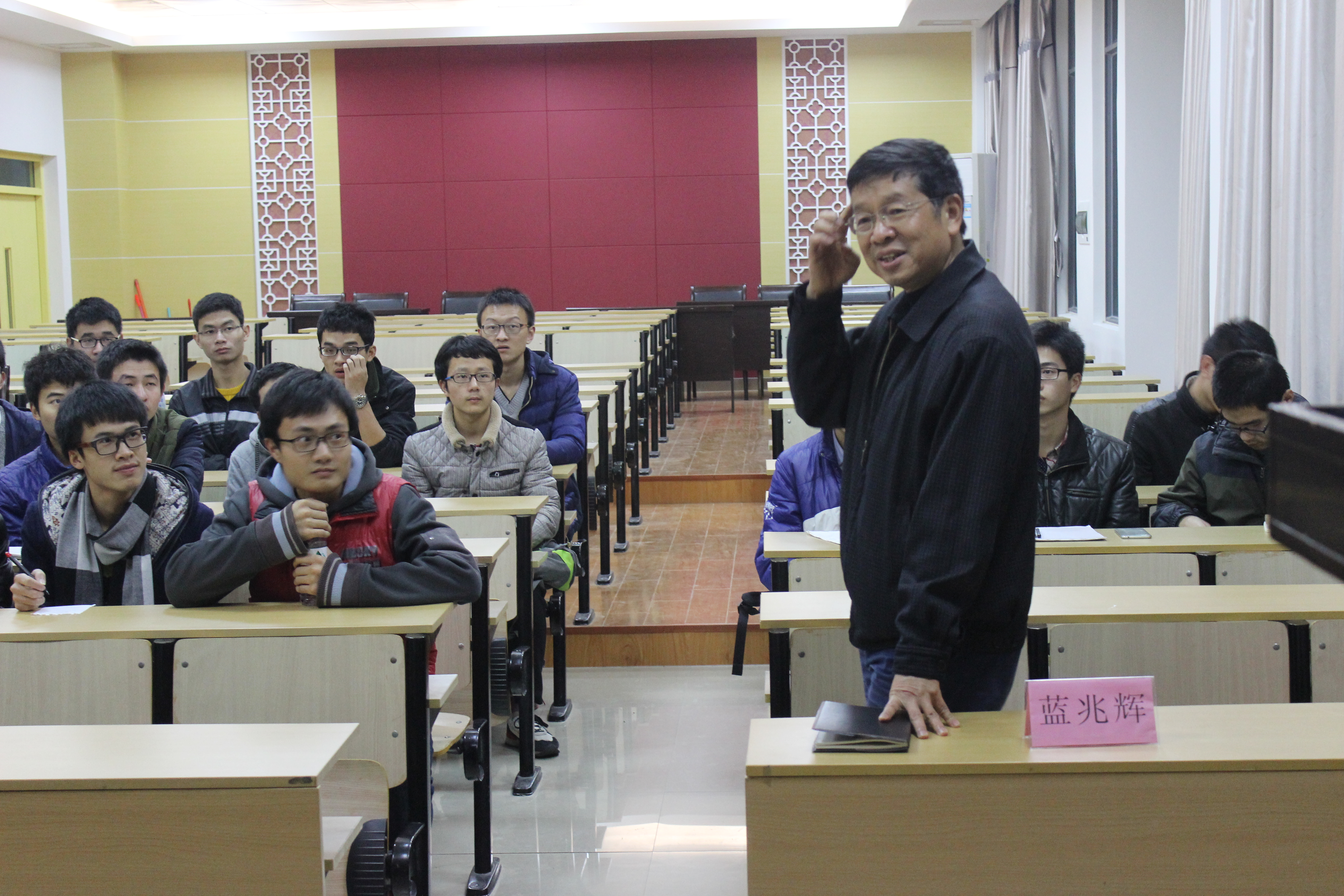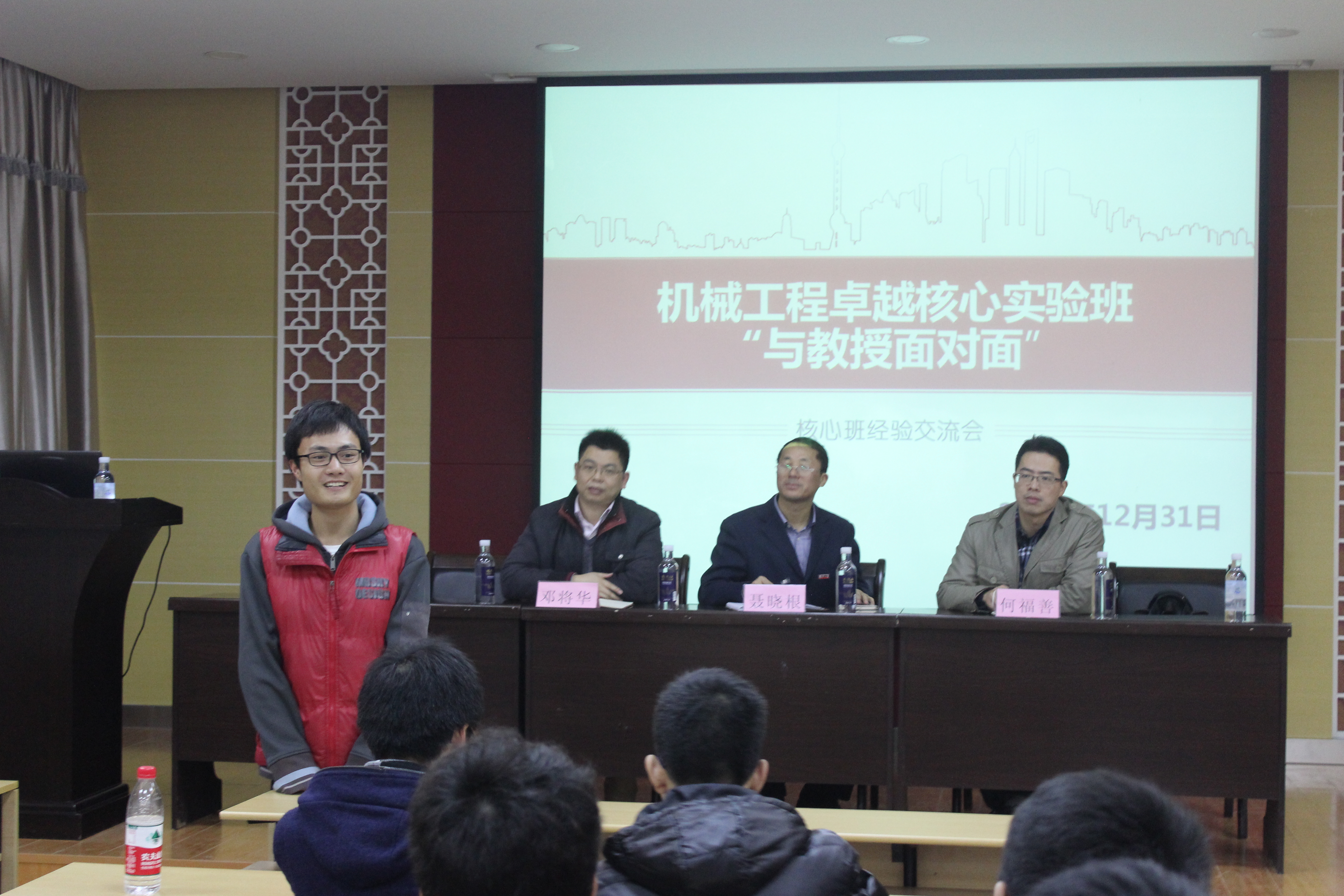 北楼415教室与2014级机械工程卓越核心实验班同学们进行学习交流。出席本次交流会的有蓝兆辉老师、聂晓根老师、邓将华老师、陈绍春老师、严世榕老师、何福善老师以及2014级辅导员滕培秀老师等。