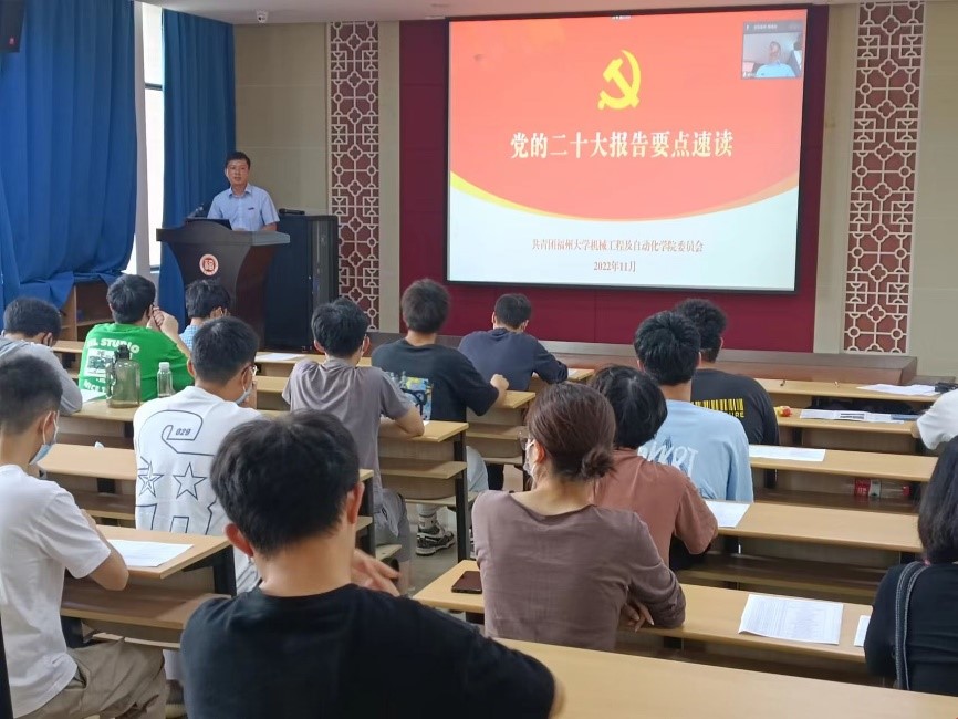 首先,林成金老师从党的二十大报告中“14个关键词”、“五个牢牢把握”、立志做有理想敢担当能吃苦肯奋斗的新时代好青年等主题,带领大家认真细致地学习党的二十大报告精神,鼓舞各团支部书记坚定不移听党话、跟党走,以身作则,服务同学,做青年朋友的知心人,做青年工作的热心人。