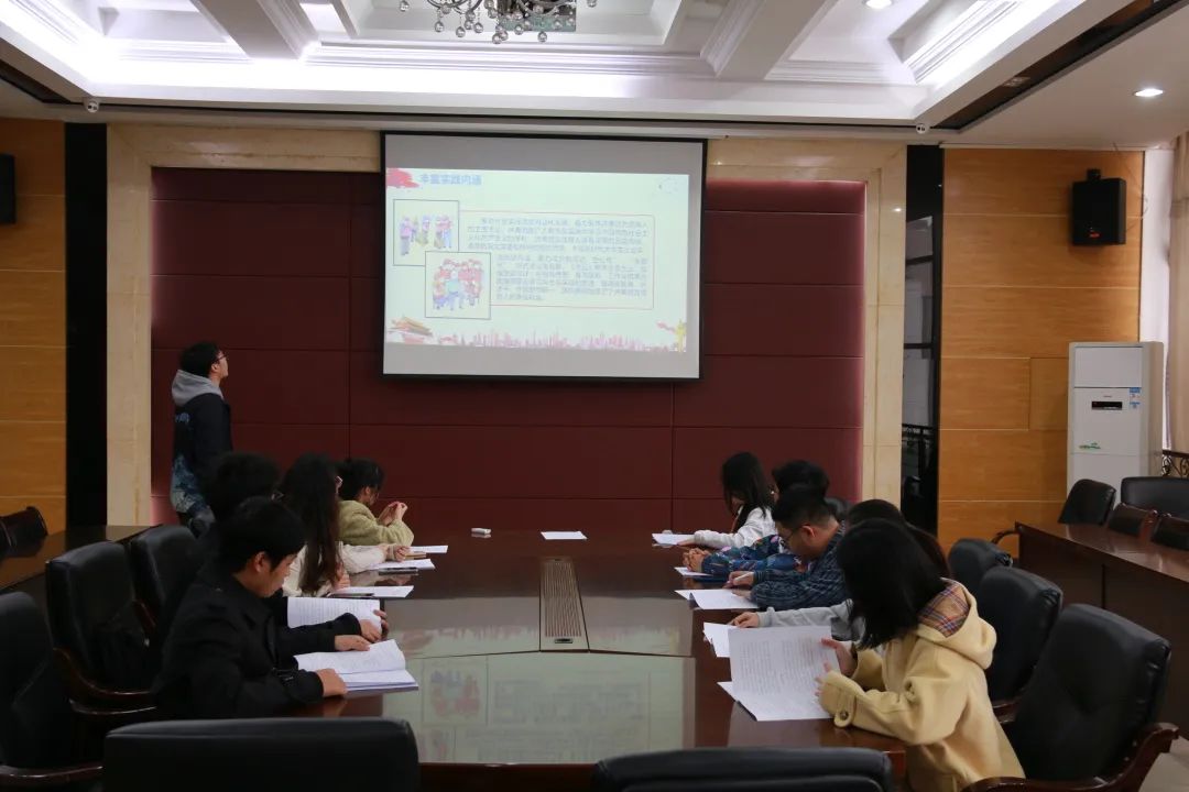 首先,由学生团委副书记王浩杰带领大家学习《意见》。《意见》指出实践育人是落实立德树人根本任务的关键环节,是高校思想政治工作体系的有机组成,要坚持为党育人、守正创新、精准施策、协同联动的基本原则,实现大学生社会实践活动的内涵更深、机制更优、体系更全、保障更深、成效更实,更好地服务大局、服务青年,推动共青团实践育人工作高质量发展。