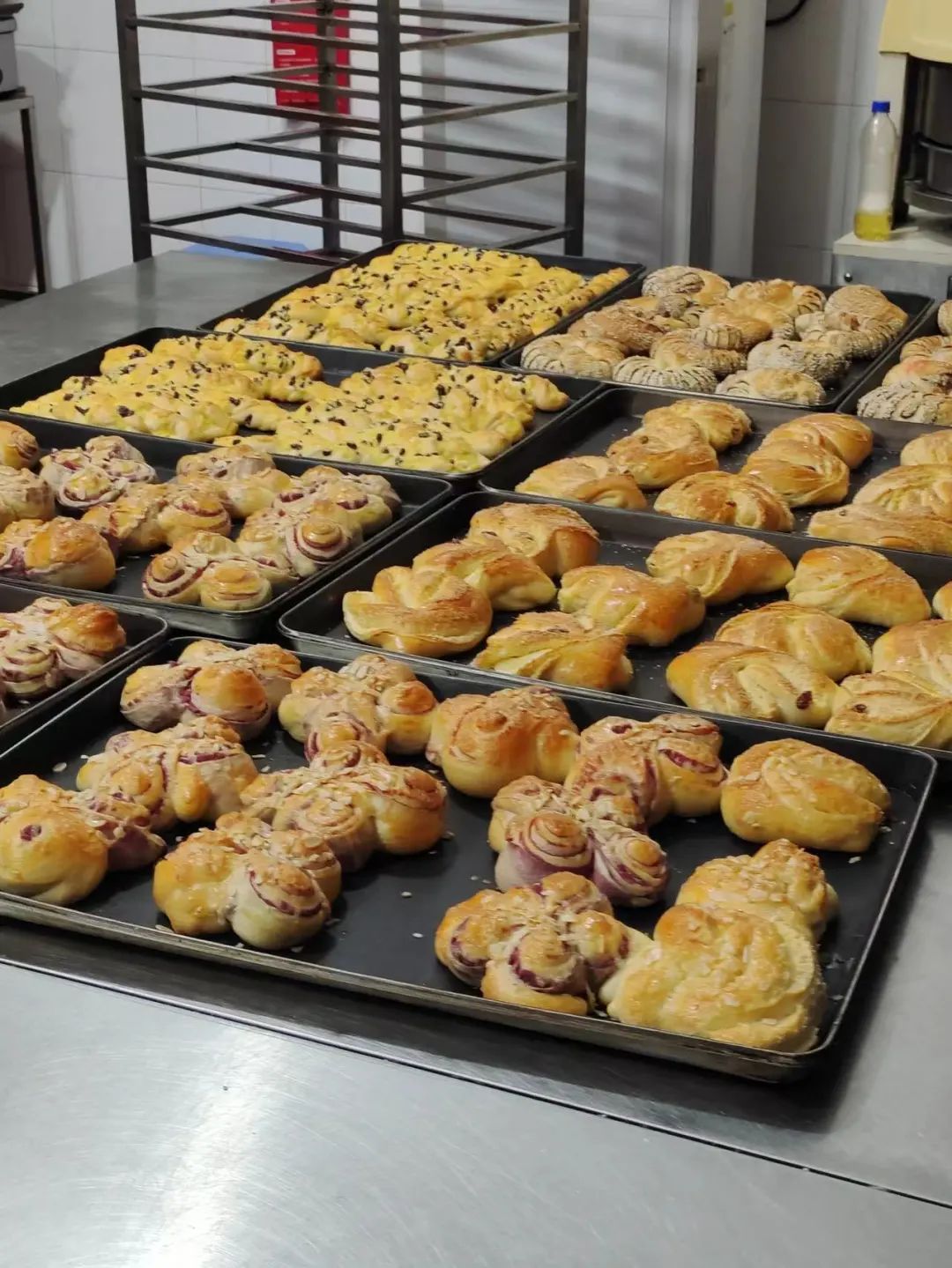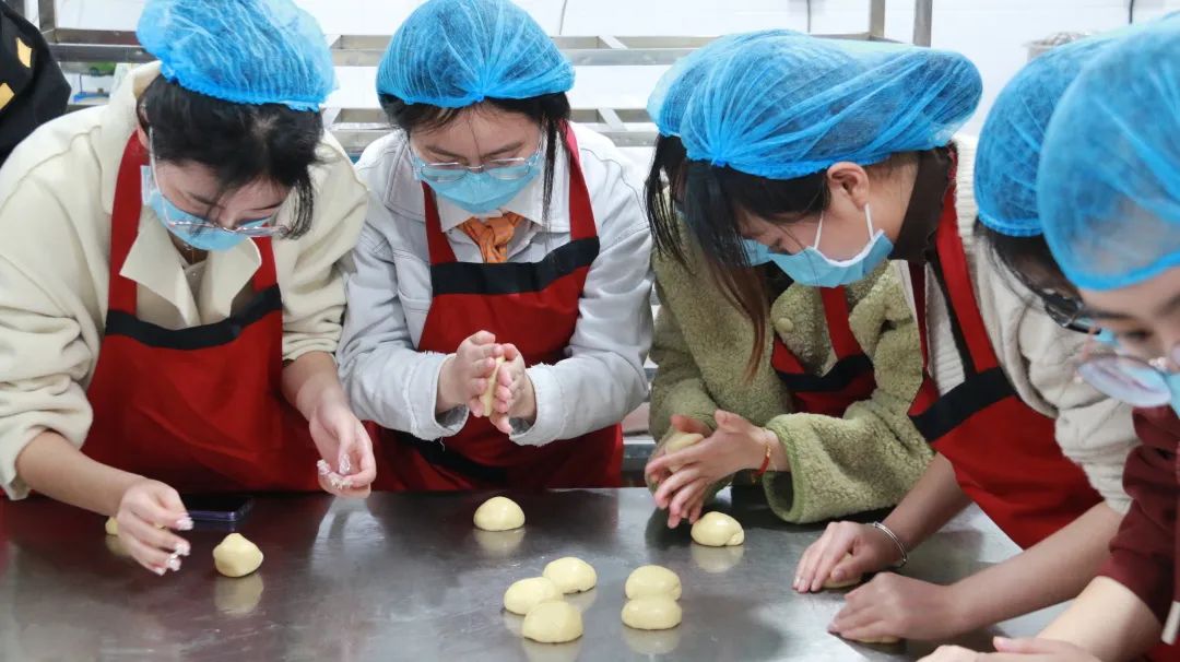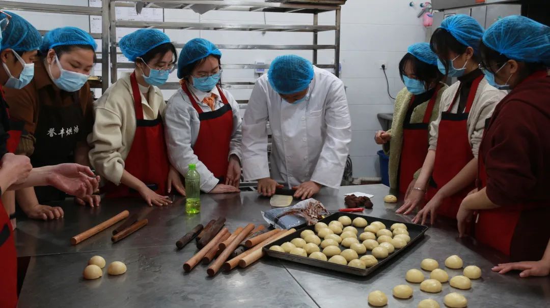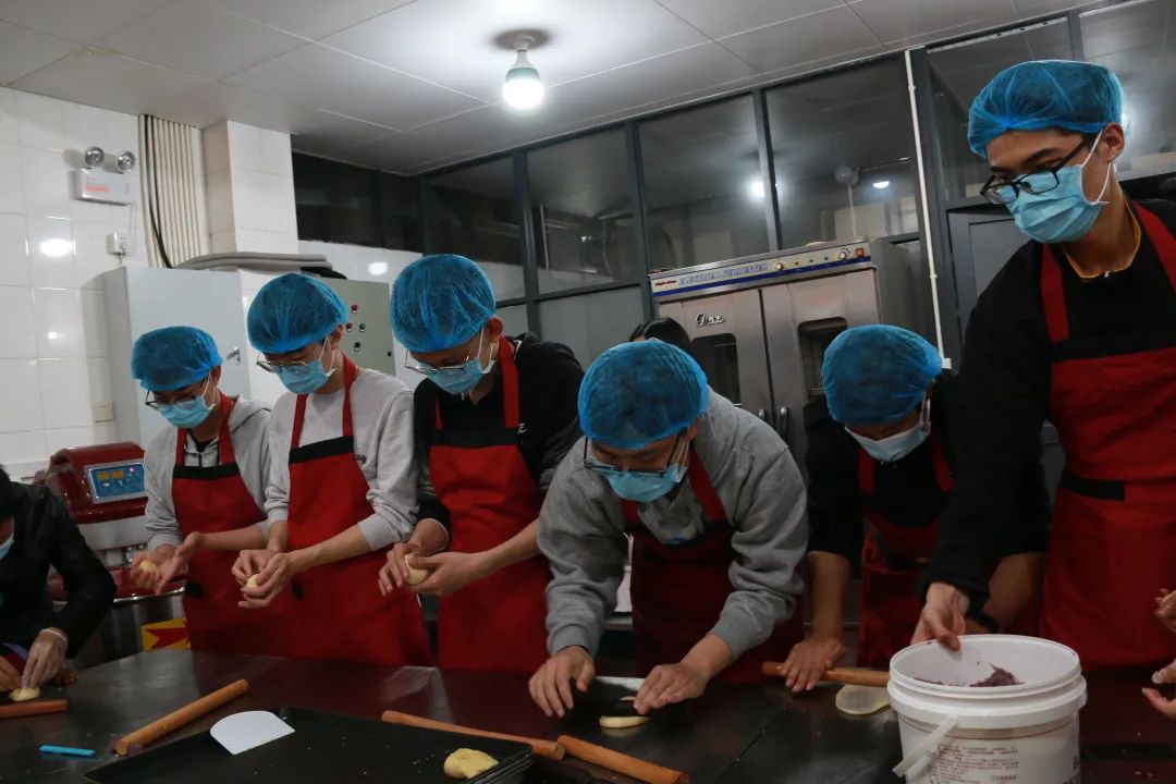 3月18日下午,同学们来到紫荆园餐厅,首先参观了食材加工区、食材储存库房等食堂工作间。参观过程中,同学们了解到目前学校食堂的现代化水平很高,里面有各种各样的设备,包括烤箱、面团机、烤箱等,可以根据不同的面包和糕点种类选择使用设备。随后同学们在现场师傅的带领下学习了面包制作的方法和技巧。通过师傅的讲解,同学们迅速掌握了不同种类面包的制作方法,随即投入到热火朝天的制作过程中。大家齐心协力,最终完成了面包制作任务,一起品尝了自己的劳动成果。