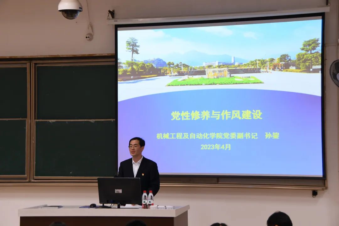 开班仪式后,机械学院党委副书记兼纪委书记孙鋆老师作《党性修养与作风建设》第一讲专题党课。孙鋆老师从《中国共产党章程》谈起,详细说明了“党性”与“党性修养”的具体内涵,结合中华优秀传统文化,强调党员学生应当坚持马克思主义,培育和践行社会主义核心价值观。他回顾了党的作风建设的历史进程,希望学生党员坚持和弘扬党的优良传统和作风,努力做好“理论联系实际”、“密切联系群众”、“批评与自我批评”,不断增强党性修养和作风建设。