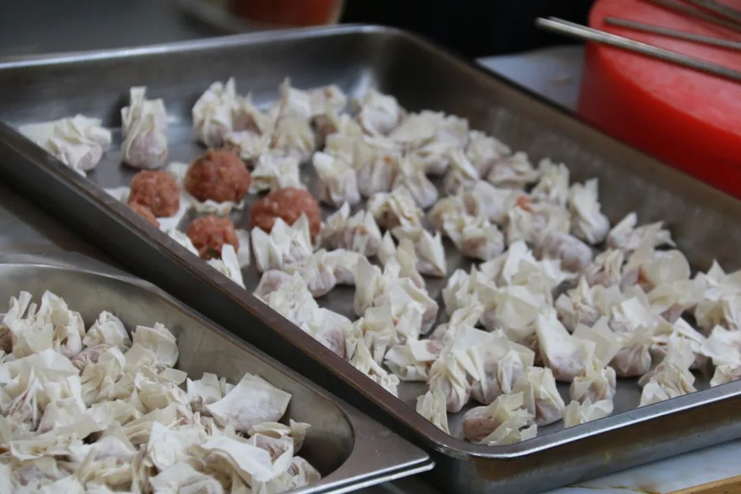 结束剁馅后,师傅们就带着同学们把肉馅进行调味,随后到了包肉燕的环节。包肉燕的第一步就是往肉燕皮上洒上水,林师傅解释道“这是防止肉燕皮黏在一起,不好拿取。”拿起一张肉燕皮,一取,取适当的肉馅放于皮中间;二包,把肉馅包起来;三捏,把肉燕皮的边缘捏紧;这样一个肉燕就包好了。