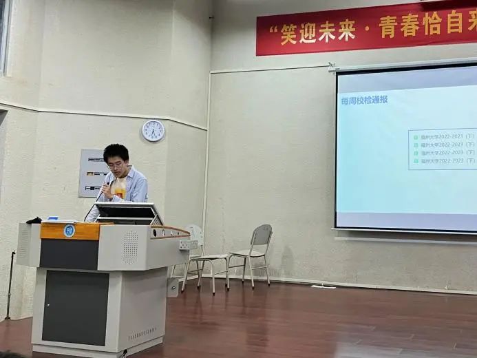 宿舍管理岗副段长郑智杰通报了上周校检情况及本学期校检上榜情况,介绍了安全检查的校检工作细则,简述了一些院检注意事项,并详细讲解了《学生手册》中违规电器相关条例。提醒全体同学在本周四宿舍安全隐患排查前做好全面自查、整改。