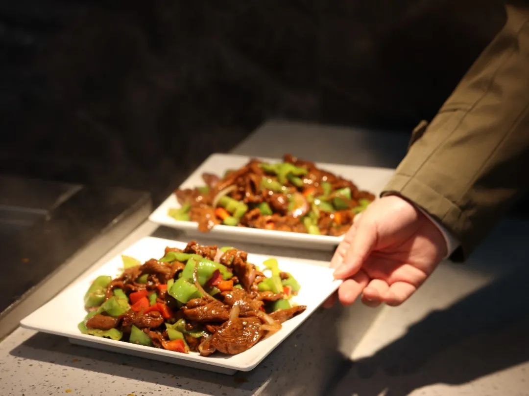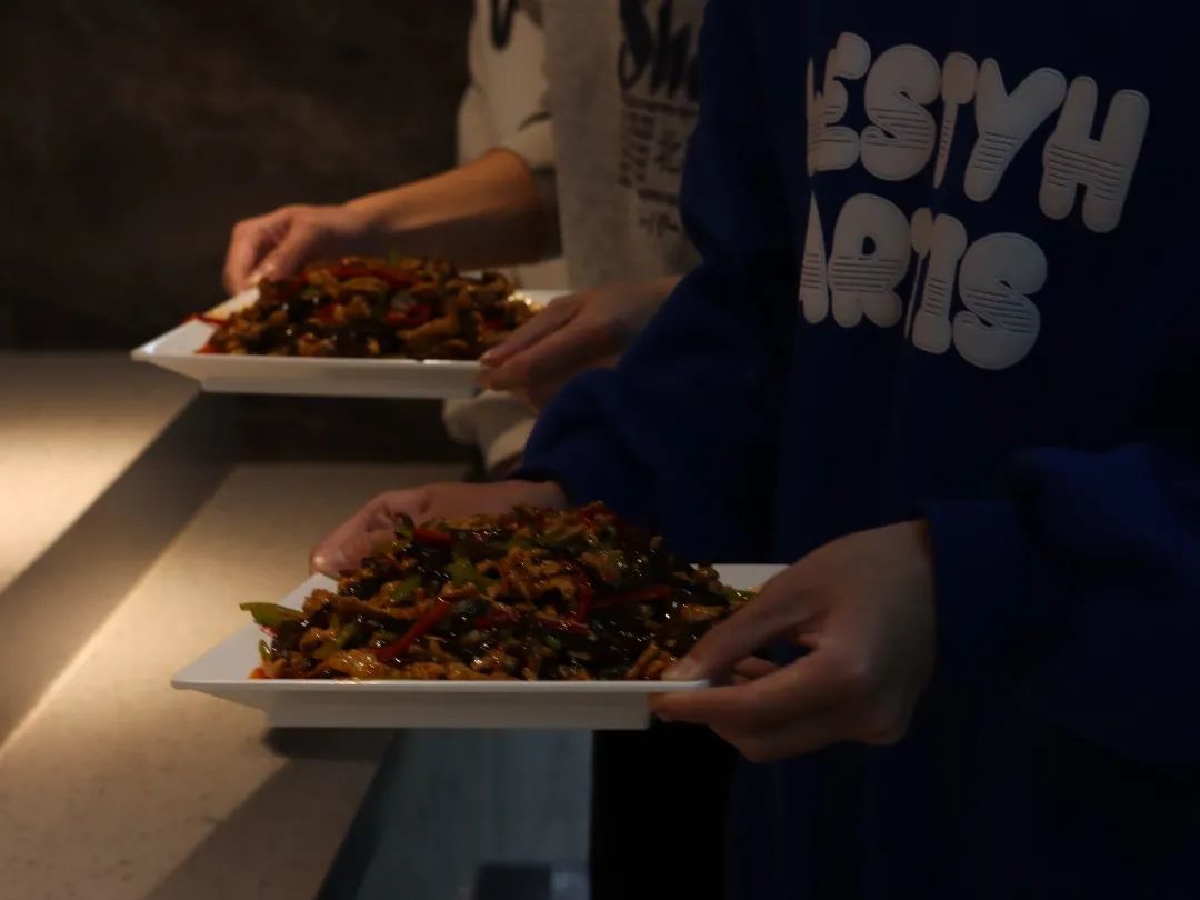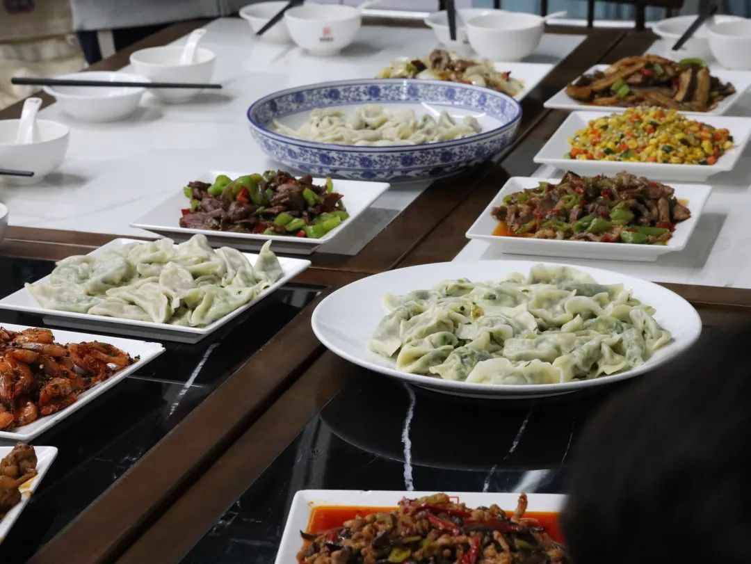 在一队同学制作水饺的同时,另一队同学围在锅旁,依次准备着九道家常菜。大火烹调使气氛热烈,水汽与油烟扑面而来,引得在食堂就餐的同学纷纷侧目。虽早做准备,可有时难免忙乱,幸有伙房师傅出手相助。最终,一样样热腾腾的精致菜品依次出锅,令人垂涎欲滴。