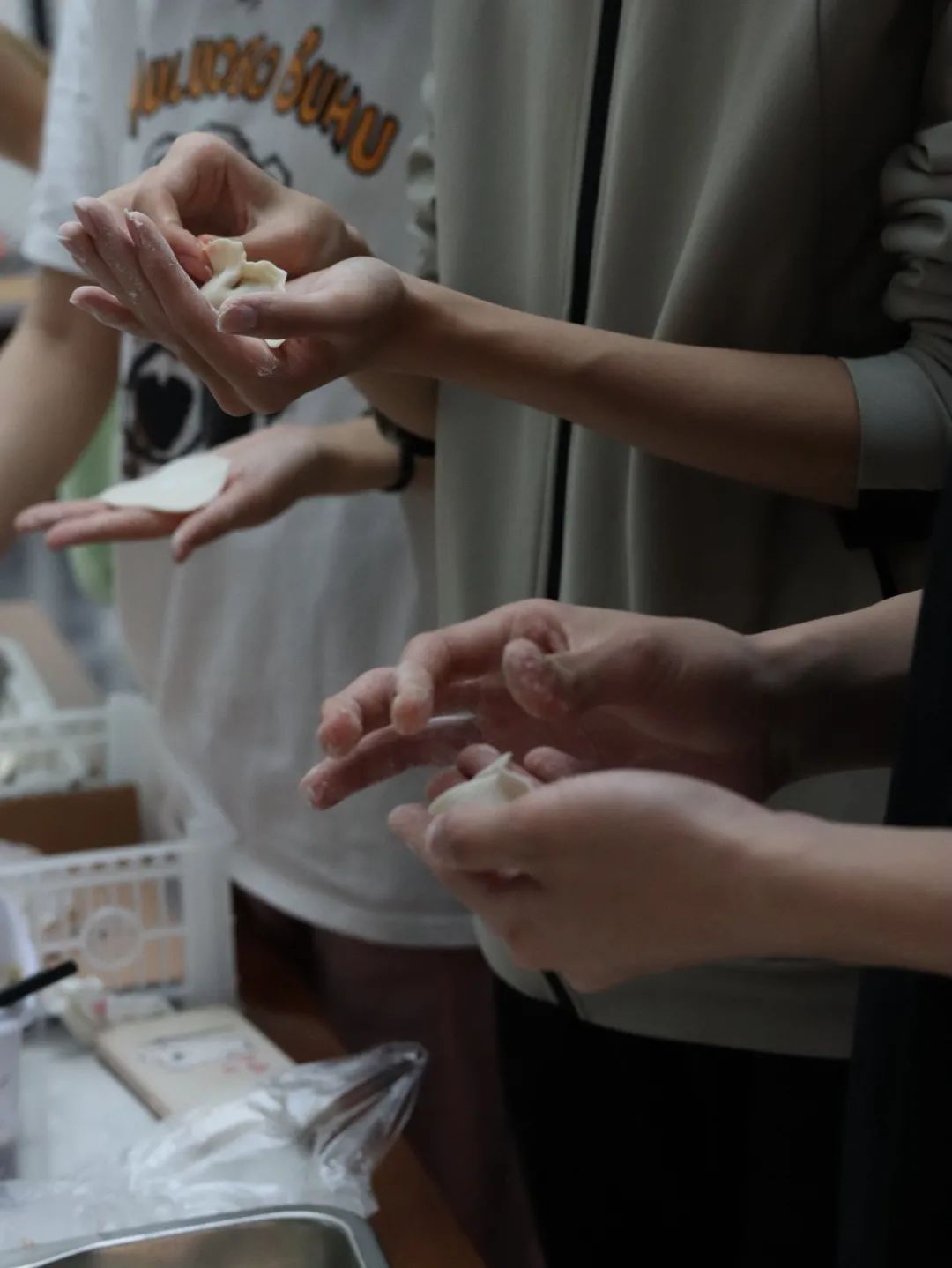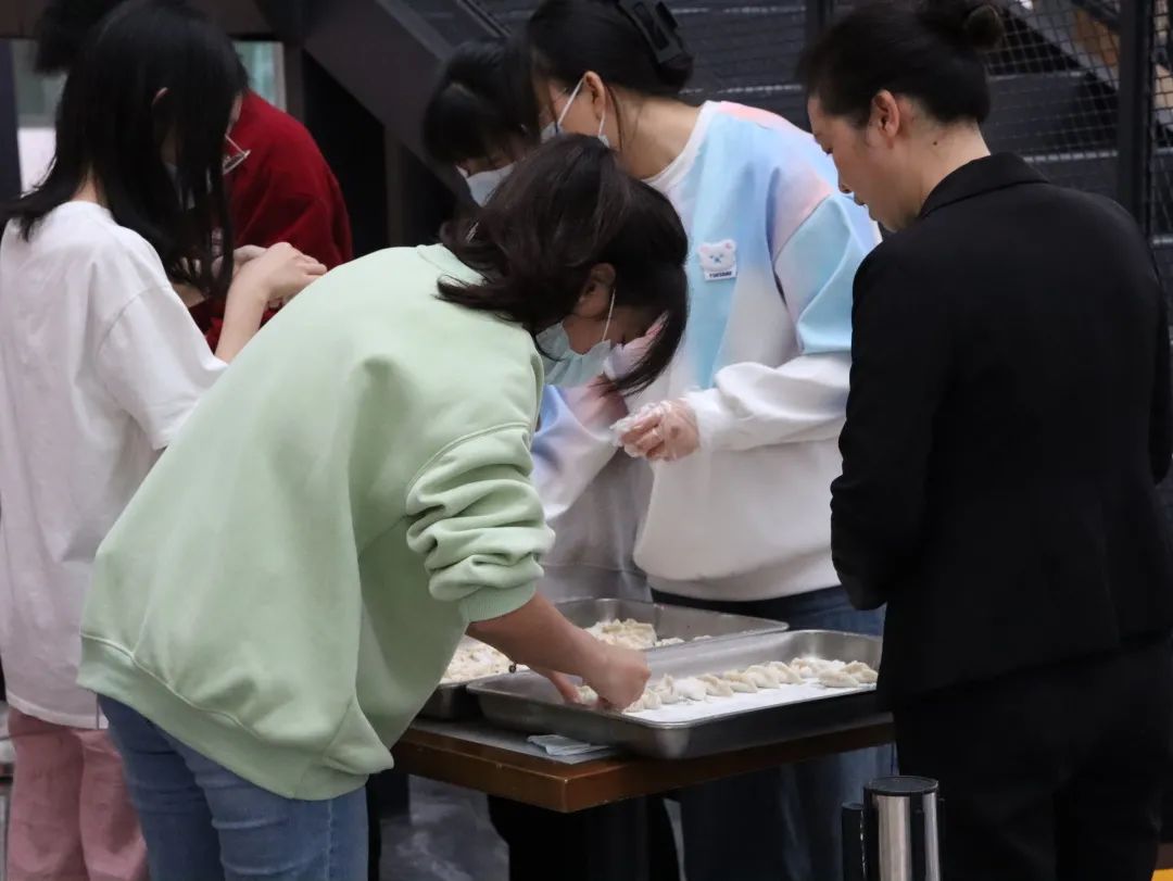 花开两朵,各表一枝。摊面、盛馅、粘皮,部分同学在餐桌前备起饺子,分工合作,有条不紊,一只只“形状各异”的水饺在屉上铺排开来。食堂工作人员向同学们讲解了饺子的多种包法以及相关技巧,同学们认真学习。