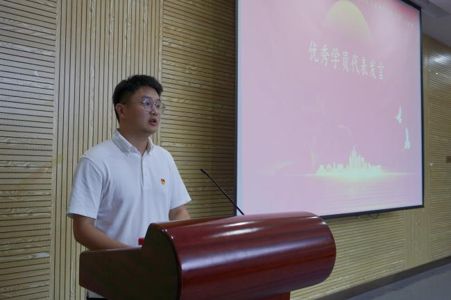 优秀学员代表、机械学院2019级本科生机制二班党支部书记邓良发言。邓良同学向分党校授课的领导、老师表达了由衷的感谢,深情回顾了自己从一名党务“小白”逐渐成长为一名有党建实务经验的支部书记的历程和感悟。