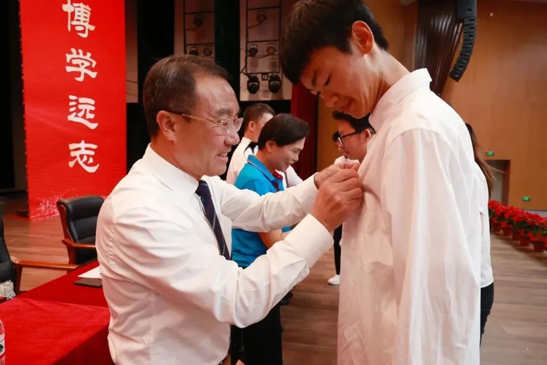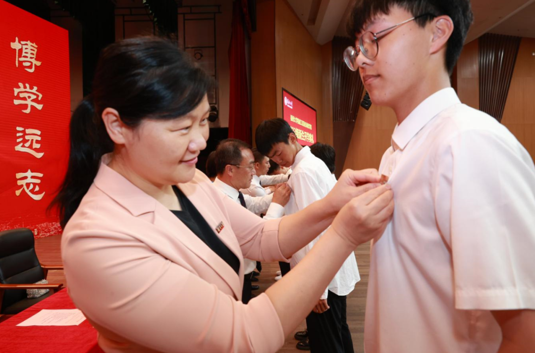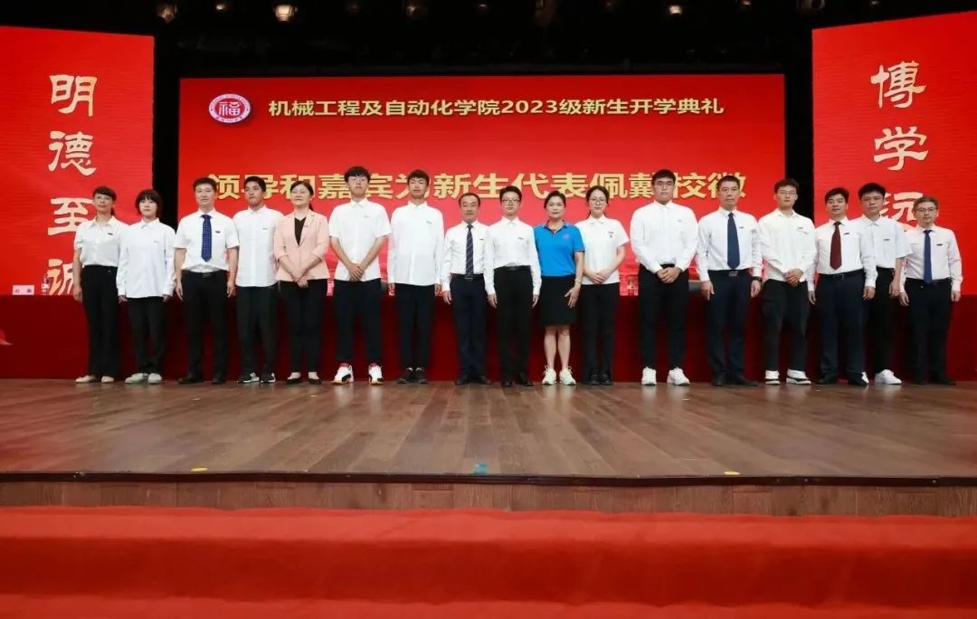 学院领导为新生代表佩戴校徽,希望机械学子秉承av大平台