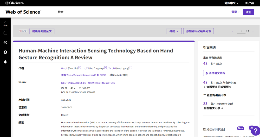 Human-Machine Interaction Sensing Technology Based on Hand Gesture Recognition: A Review该文由郭霖、卢宗兴和姚立纲教授共同编撰。本文旨在使读者能够系统、快速地了解手势识别的研究现状,揭示手势识别的基本问题和发展方向。文章以手势识别技术所采用的传感方法为切入点,通过总结近年来人机交互领域的研究成果,详细的阐述人机交互系统的研究现状,并展望未来人机交互领域的发展方向。目前,该论文在Web of Science上实时引用为48次。