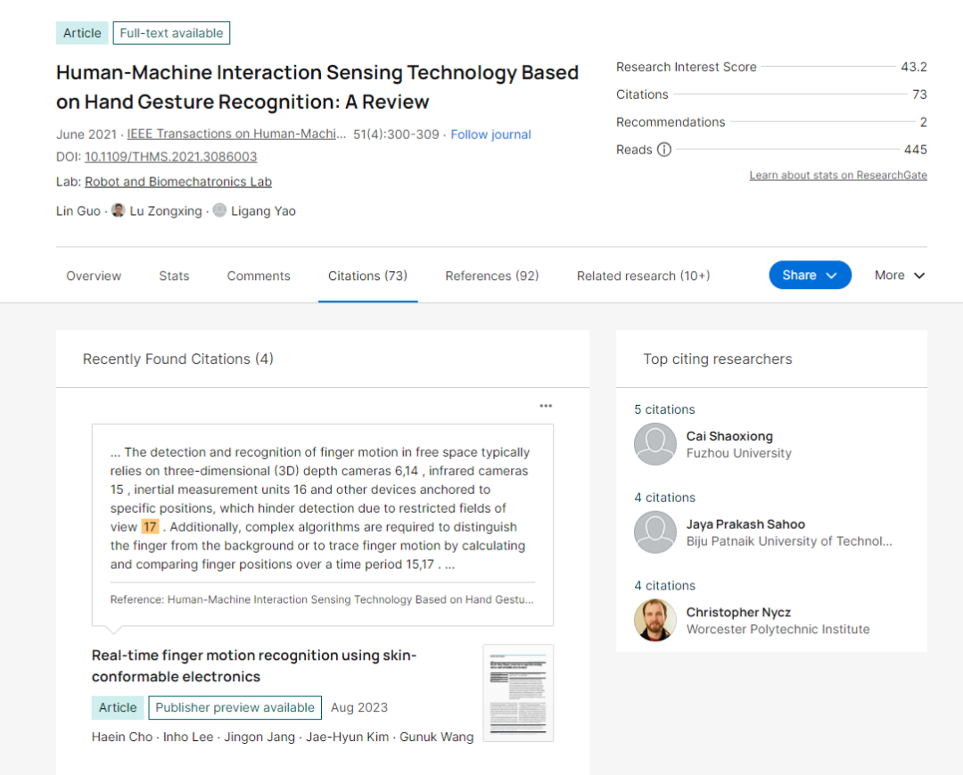 郭霖、卢宗兴和姚立纲共同编撰发表于IEEE Transactions on Human-Machine Systems, 2021年第4期的“Human-Machine Interaction Sensing Technology Based on Hand Gesture Recognition: A Review”一文,近期被《Nature》 旗下子刊Nature Electronics 2023年的论文“Real-time finger motion recognition using skin-conformable electronics”引用,详见其参考文献17。