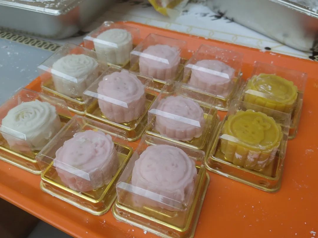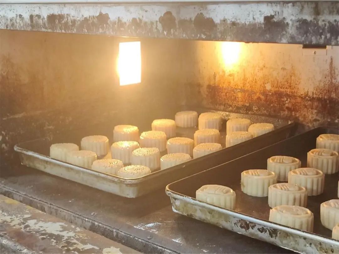随着一个个芋泥馅、板栗馅、莲蓉蛋黄馅、豆沙蛋黄馅的月饼被压模成型,在月饼表面轻喷一层水后,一盘盘月饼被送入烤箱,烘焙若干分钟取出,刷上蛋黄液后再放入烤箱,经过十几分钟高温烘焙,空气中弥漫着月饼的香气,就此大功告成。
