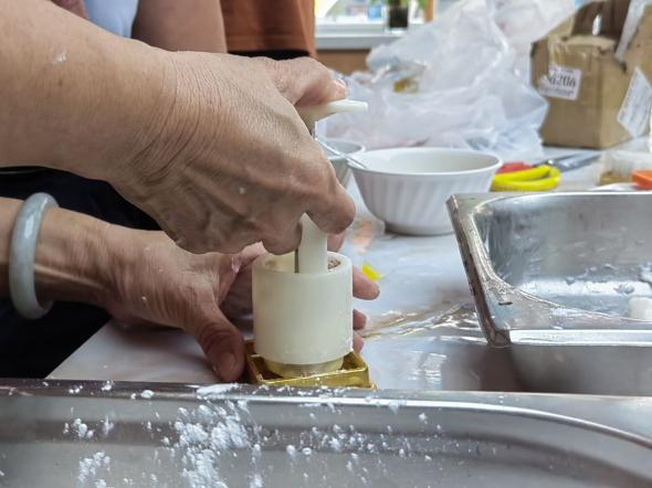 活动过程中,工作人员为大家讲授美食课堂,耐心指导制作冰皮月饼的步骤,并进行了一遍演示——倒粉、加水、搅拌、轻捻、蘸油、轻揉成球、放入模具、一按一放,数分钟内,一个小巧精致的月饼就从模具中“脱身”而出。