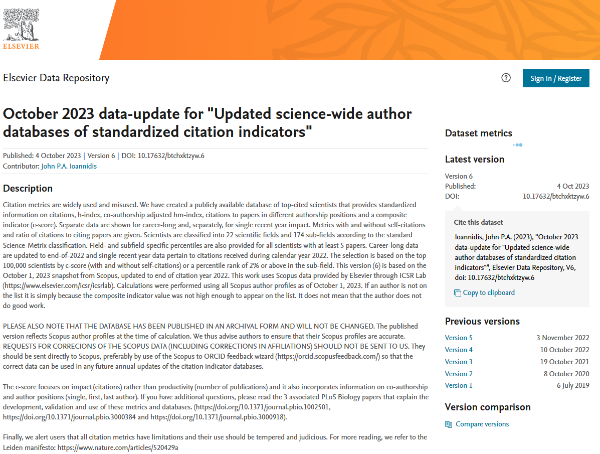榜单来源:Ioannidis, John P.A. (2023), “October 2023 data-update for "Updated science-wide author databases of standardized citation indicators"”, Elsevier Data Repository, V6, DOI: 10.17632/btchxktzyw.6